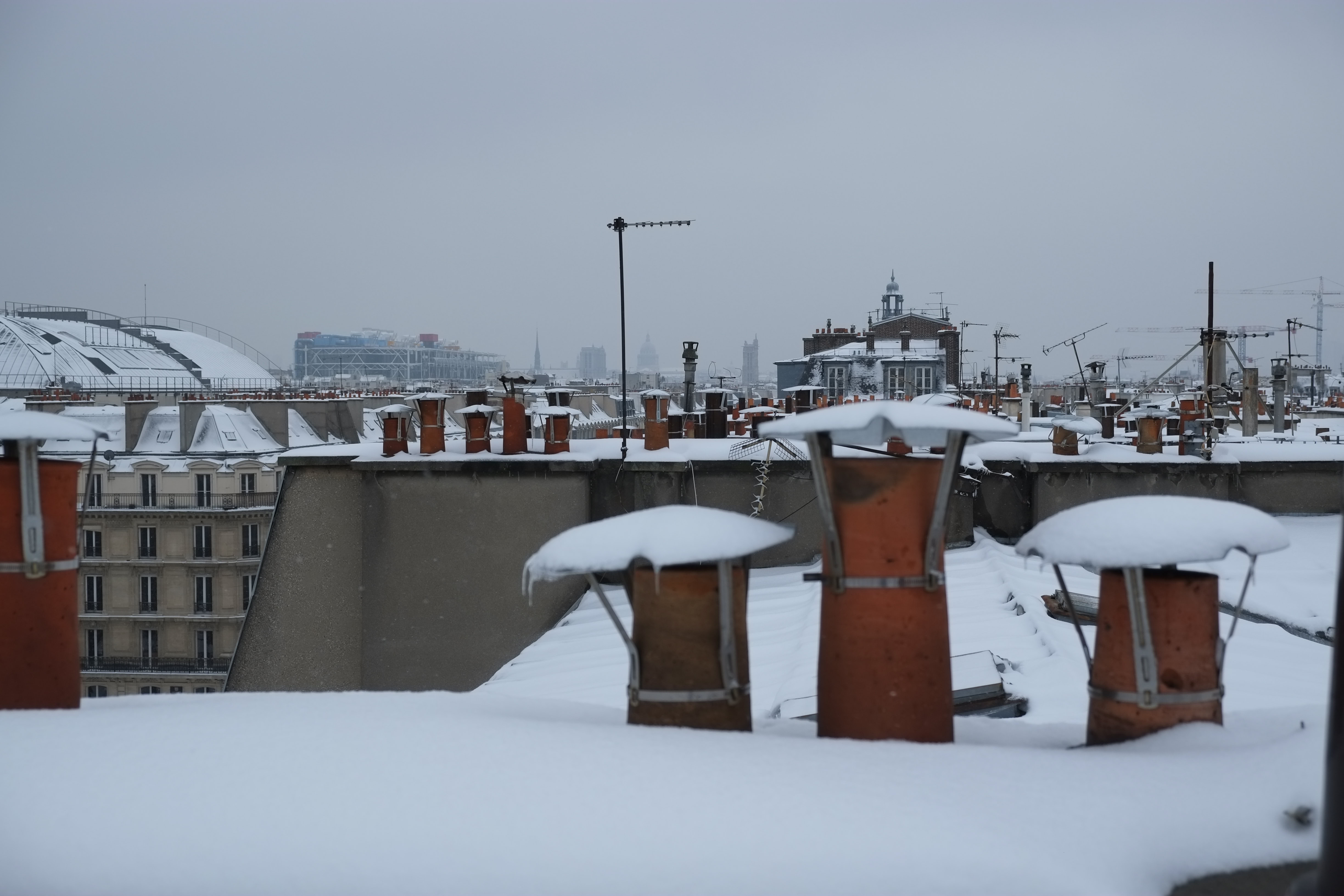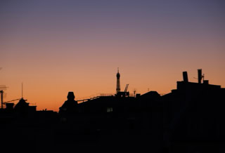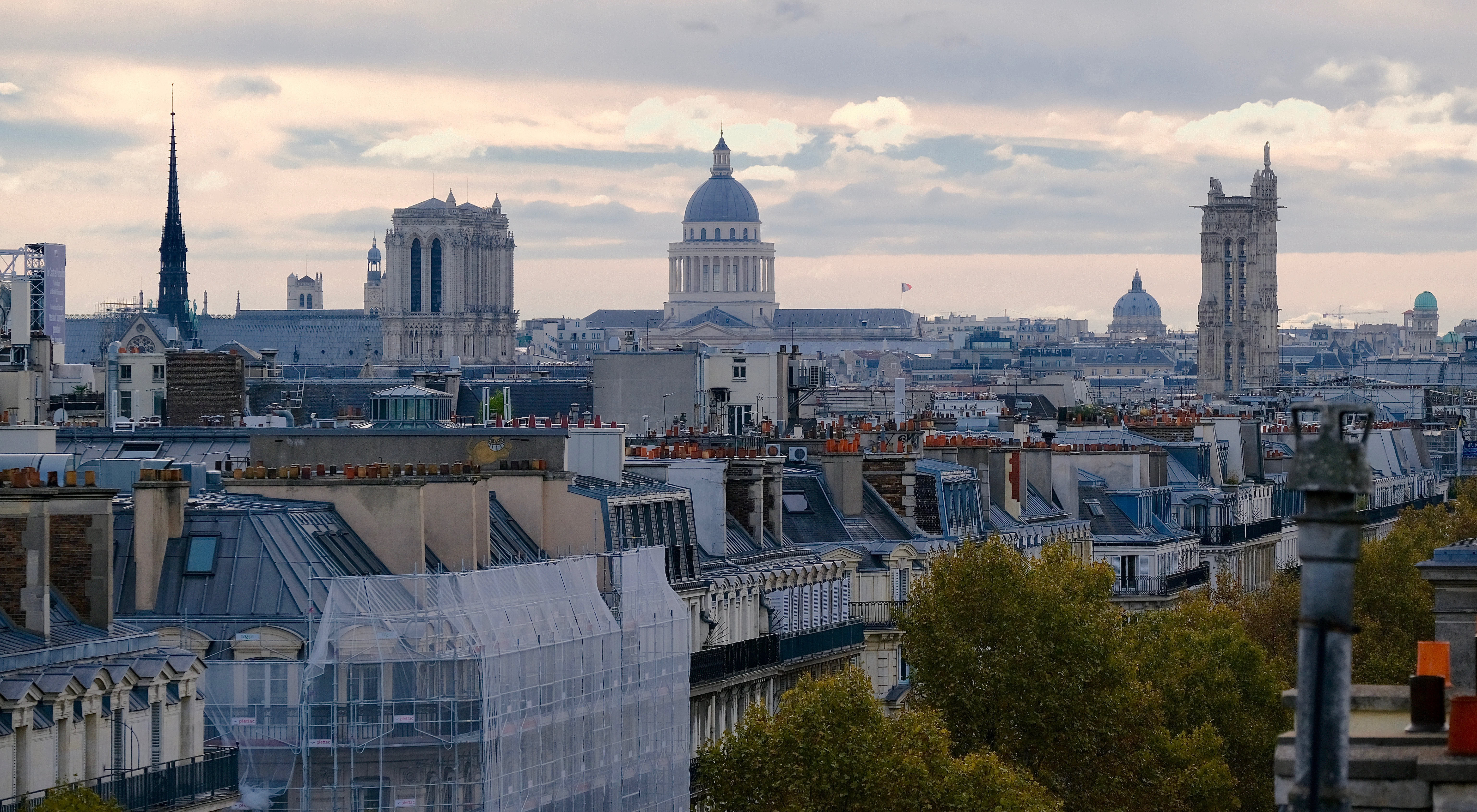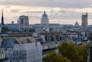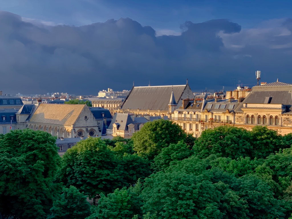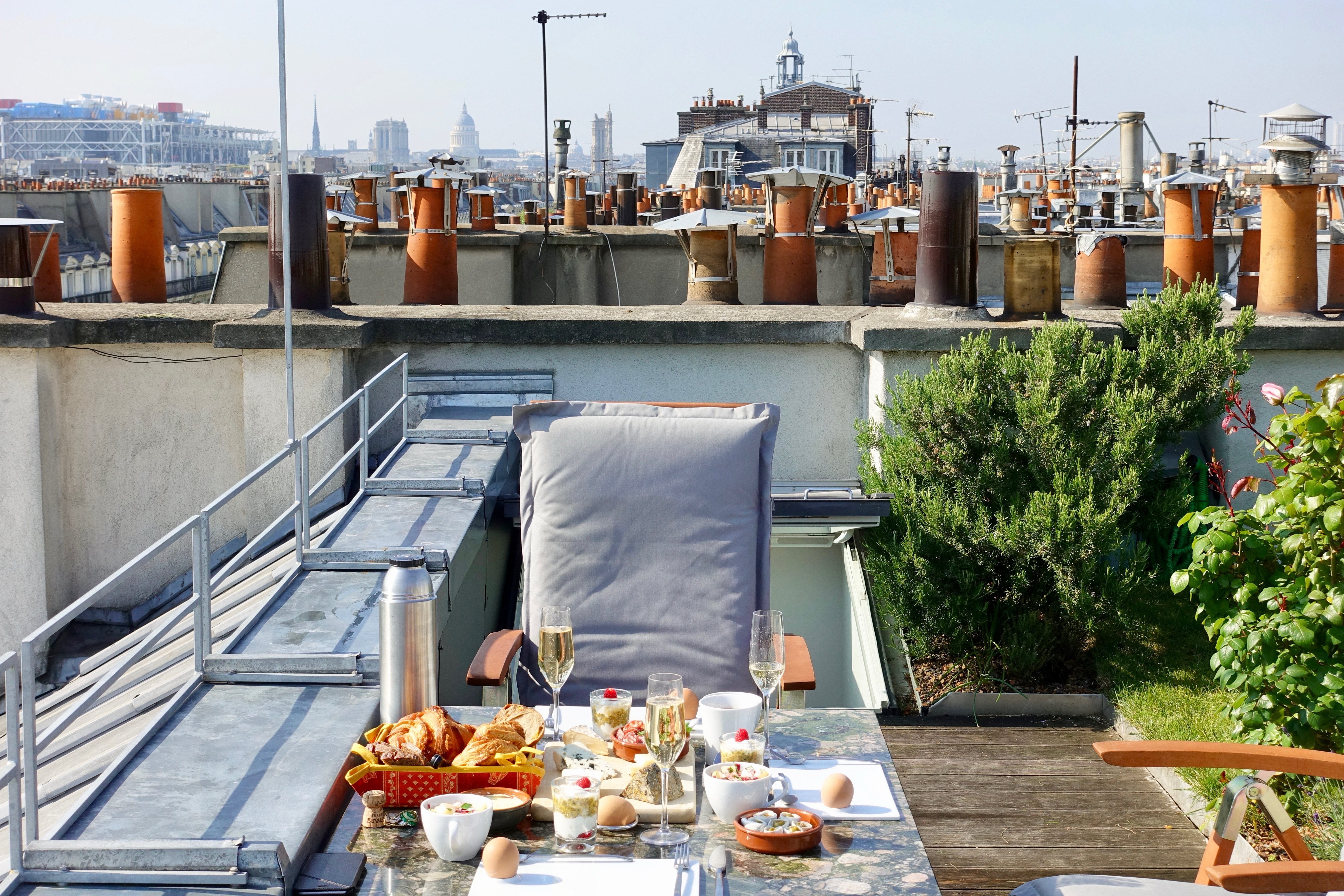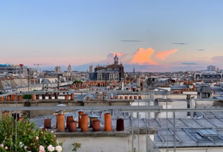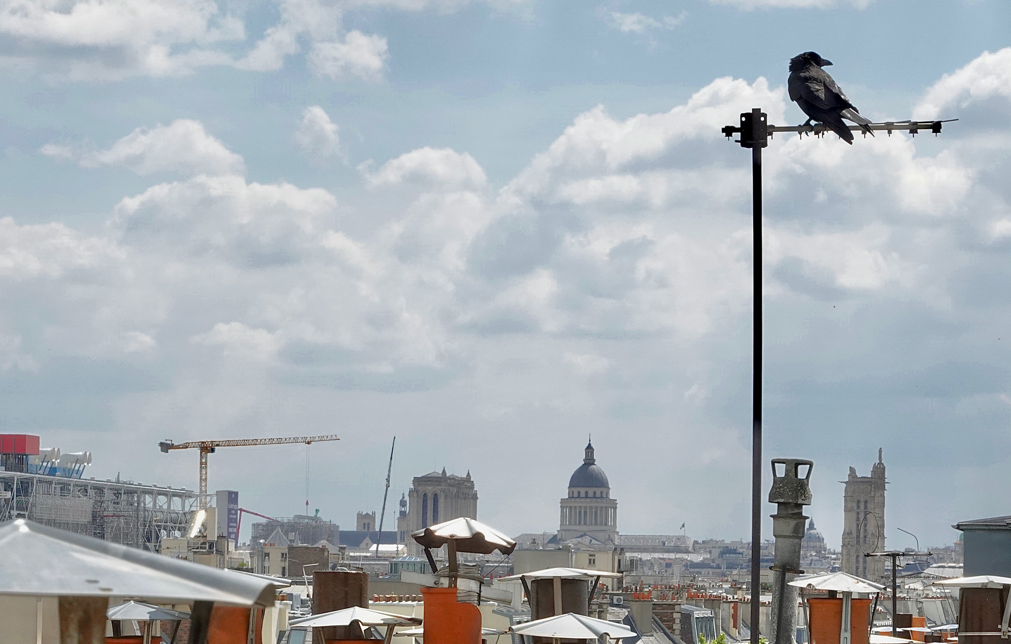 Alle große Monumente sind von der Terrasse aus zu sehen, von Sacré Cœre über Opéra, La Défense nach Süden, über den Eiffelturm, den Tour Montparnasse, St. Sulpice, St. Eustache, Tour Saint Jacques, Pantheon, Notre Dame, das Centre Georges Pompidou, Gaîté Lyrique und den Square Émille Chautemps gleitet der Blick weiter zu den historischen Gebäuden von Ars et Métiers.