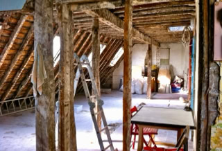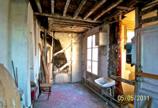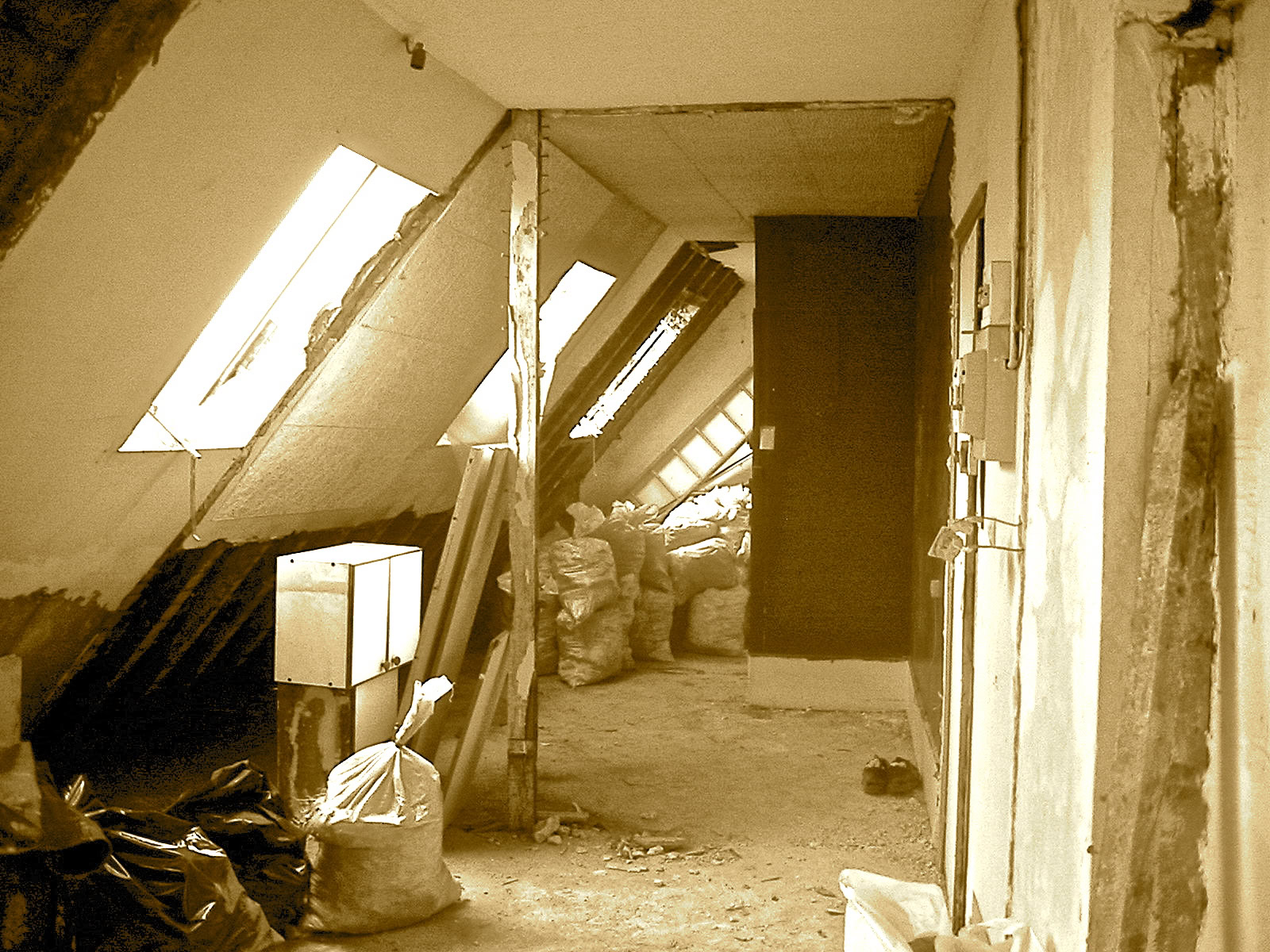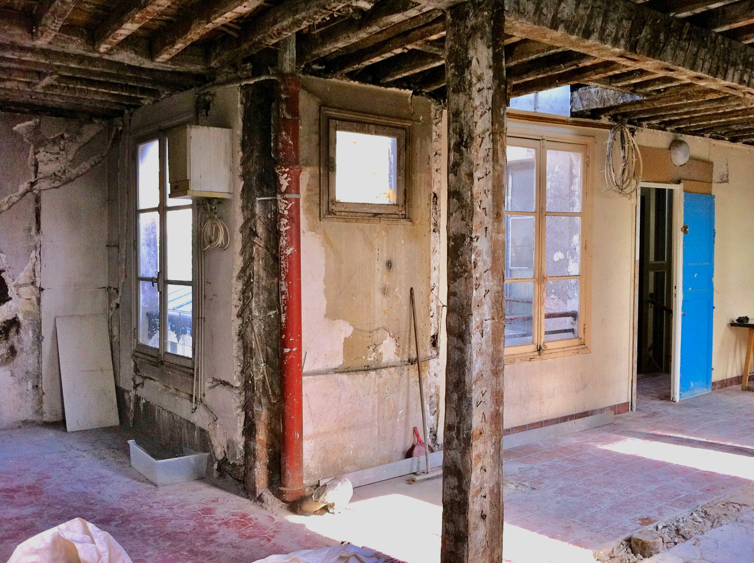 Am Anfang gab es 7 chambres de service um einen Flur mit WC und Waschbecken. Die Fenster waren zerbrochen, das Dach undicht. Die Aussenhülle musste erneuert und ein 15cm schiefer Boden ausgeglichen werden.