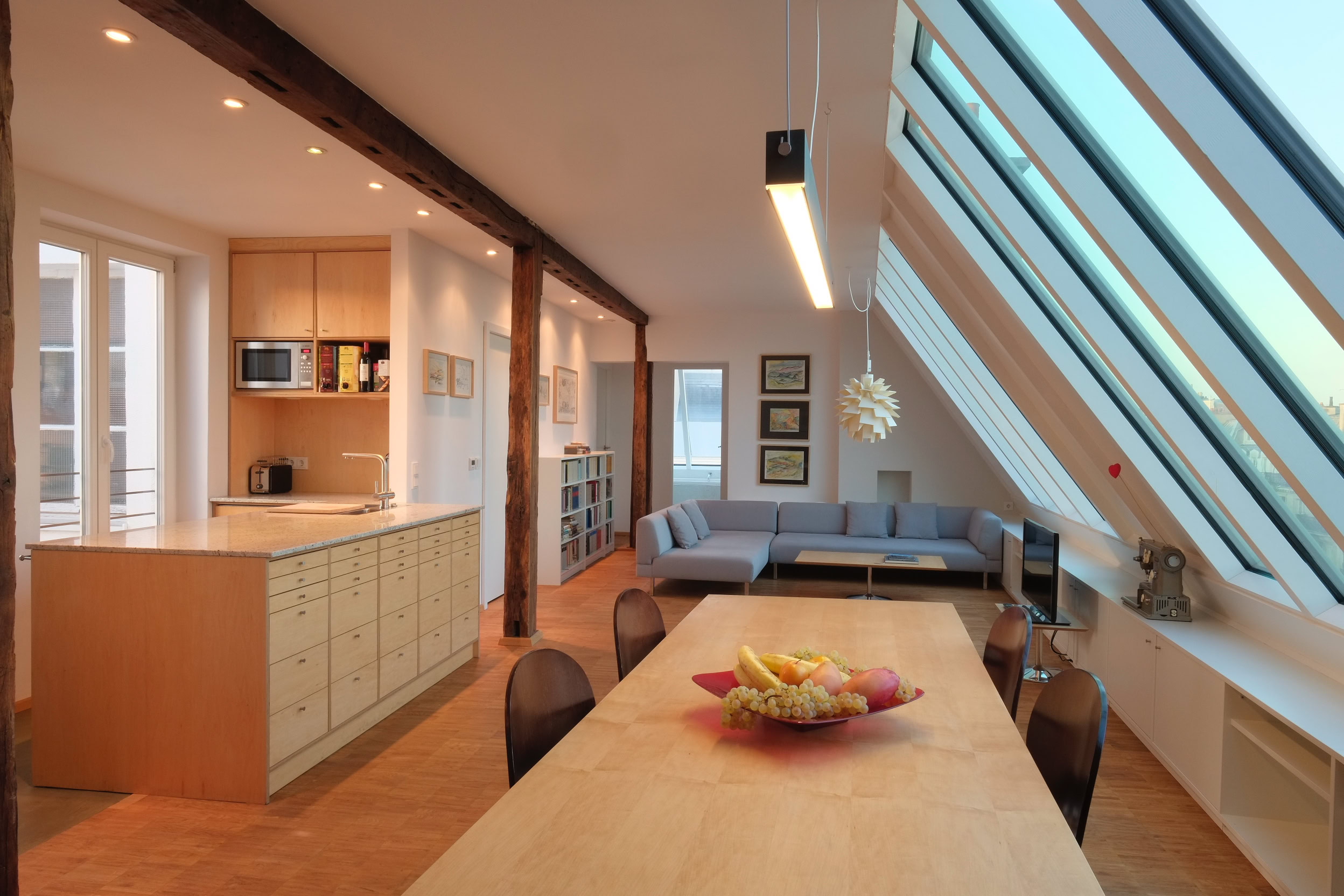 Am großzügigen Esstisch ist für 6-8 Personen Platz, sodass auch mal Gäste bewirtet werden können oder eine Besprechung mit großen Plänen abgehalten werden kann.