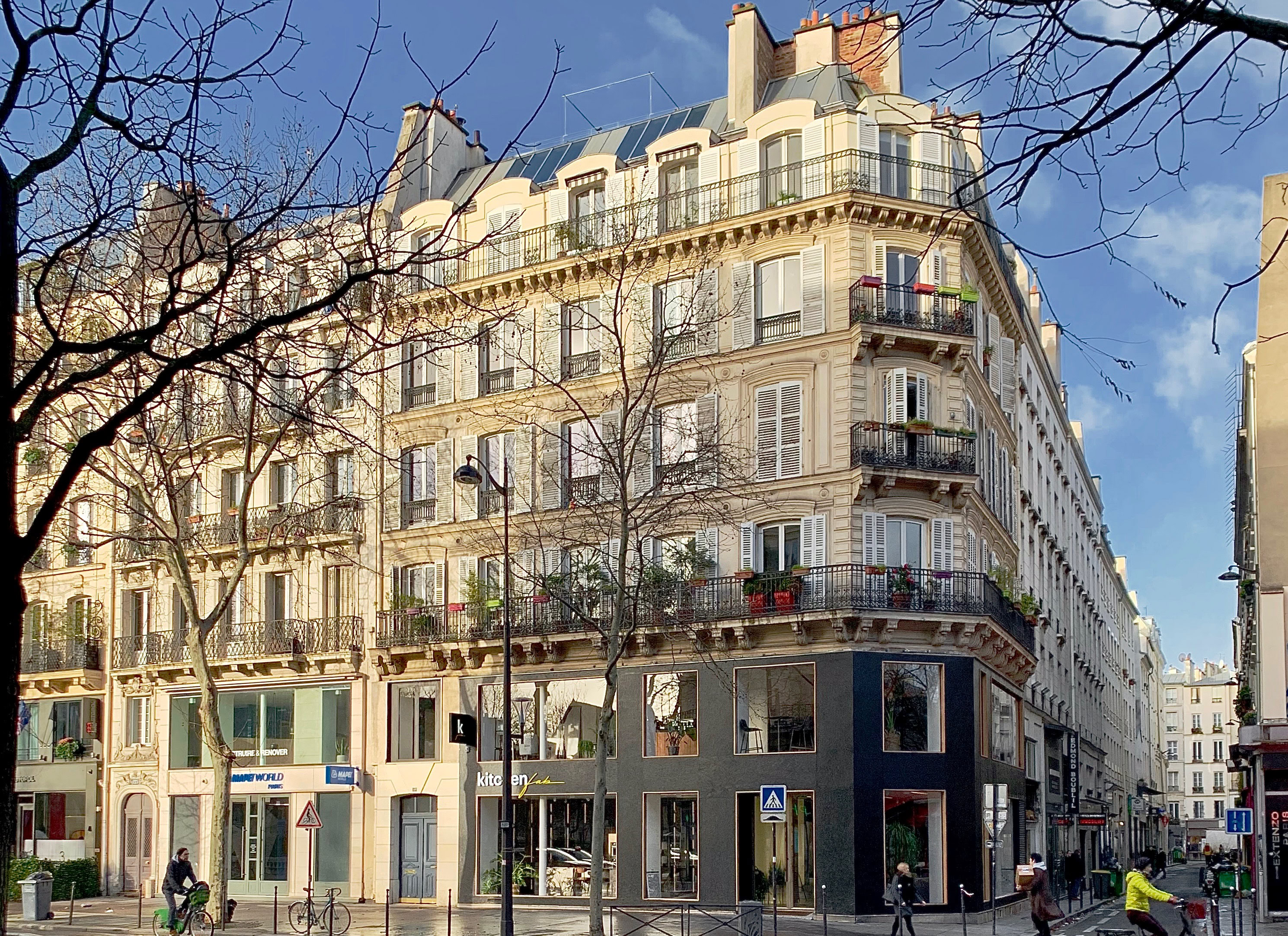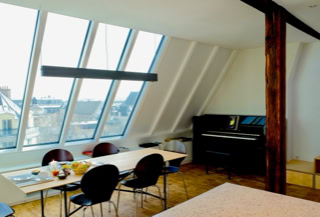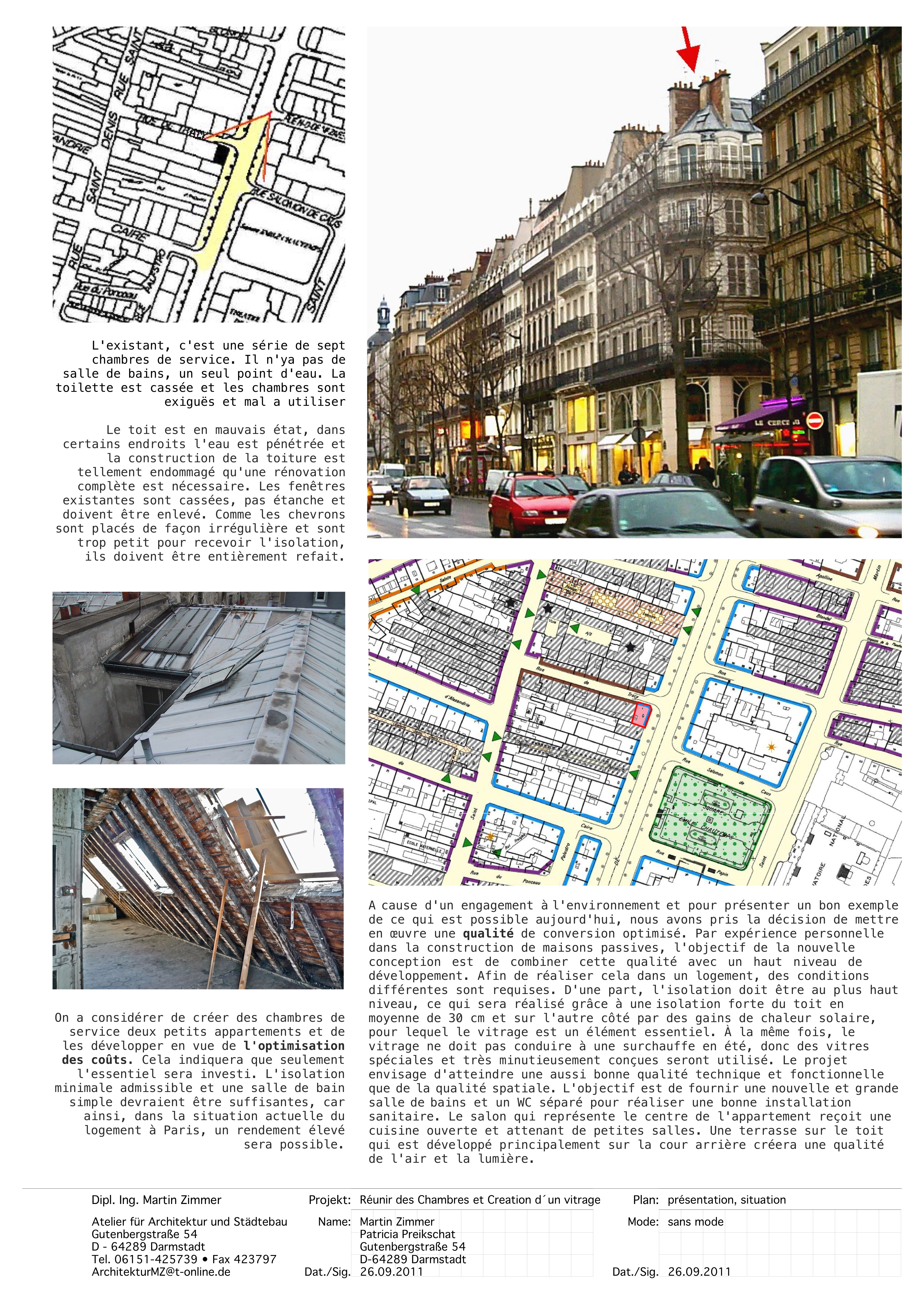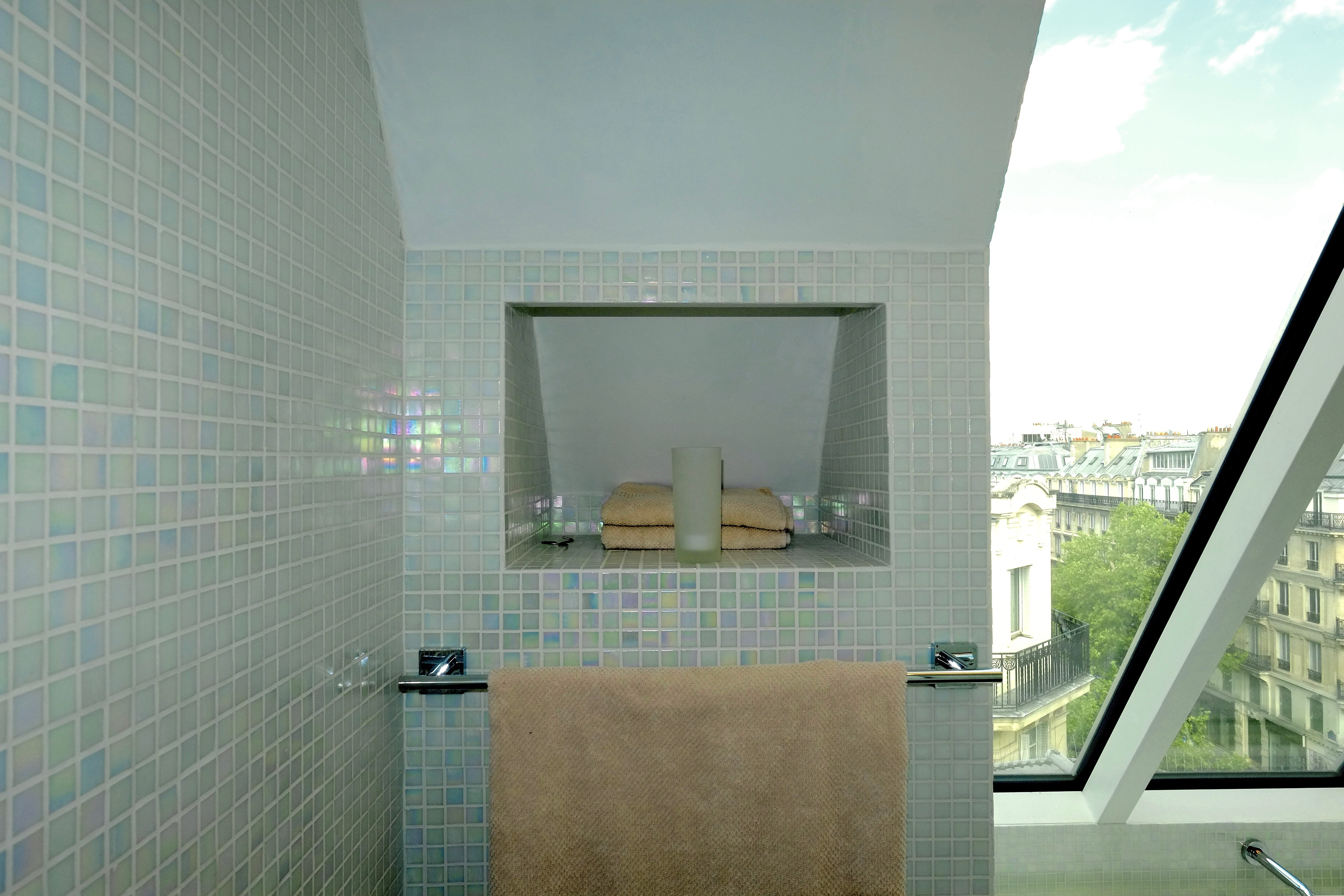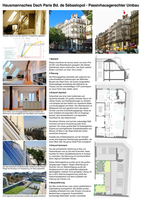 Das Gebäude ist ein Original von 1895. Das Dach bestand vor dem Umbau aus einem Hausflur umgeben von sieben ehemaligen „chambres de service“, den jeder Wohnung zugeordneten Dienstmädchenzimmern. Nach vollständiger Entkernung entstand eine komplett neue geräumige Dachwohnung in modernster Passivhausbauweise.
