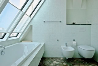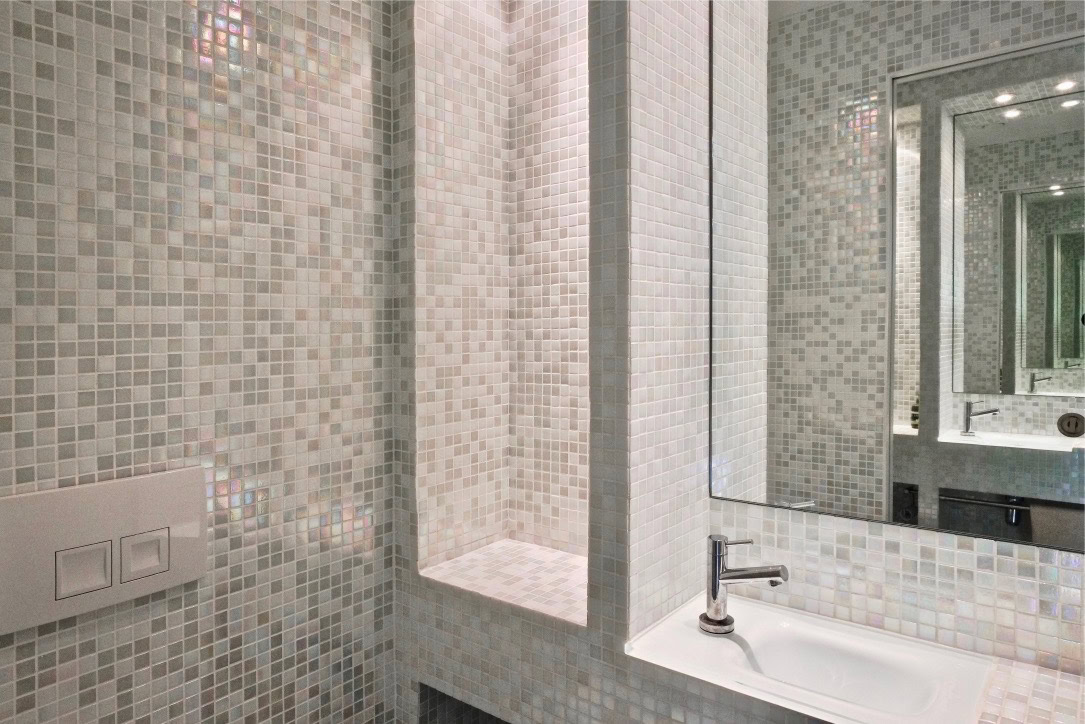 Das Bad mit Wanne, WC, Bidet Waschbecken und Dusche lebt von der Bodenplatte, die aus einem Stück gefertigt ist und niveaugleich in den Duschbereich übergeht. Sie erzählt von einem alten brasilianischen Flusslauf… Das leicht changierende Mosaik bildet einen harmonisch auf die Grüntöne der Bodenplatte abgestimmten Hintergrund und wird erweitert durch den großen Spiegel über dem Waschbecken. Mittels der LED-Steuerung lässt sich auch in der Beleuchtung mit unterschiedlichen Farbwechseln spielen.