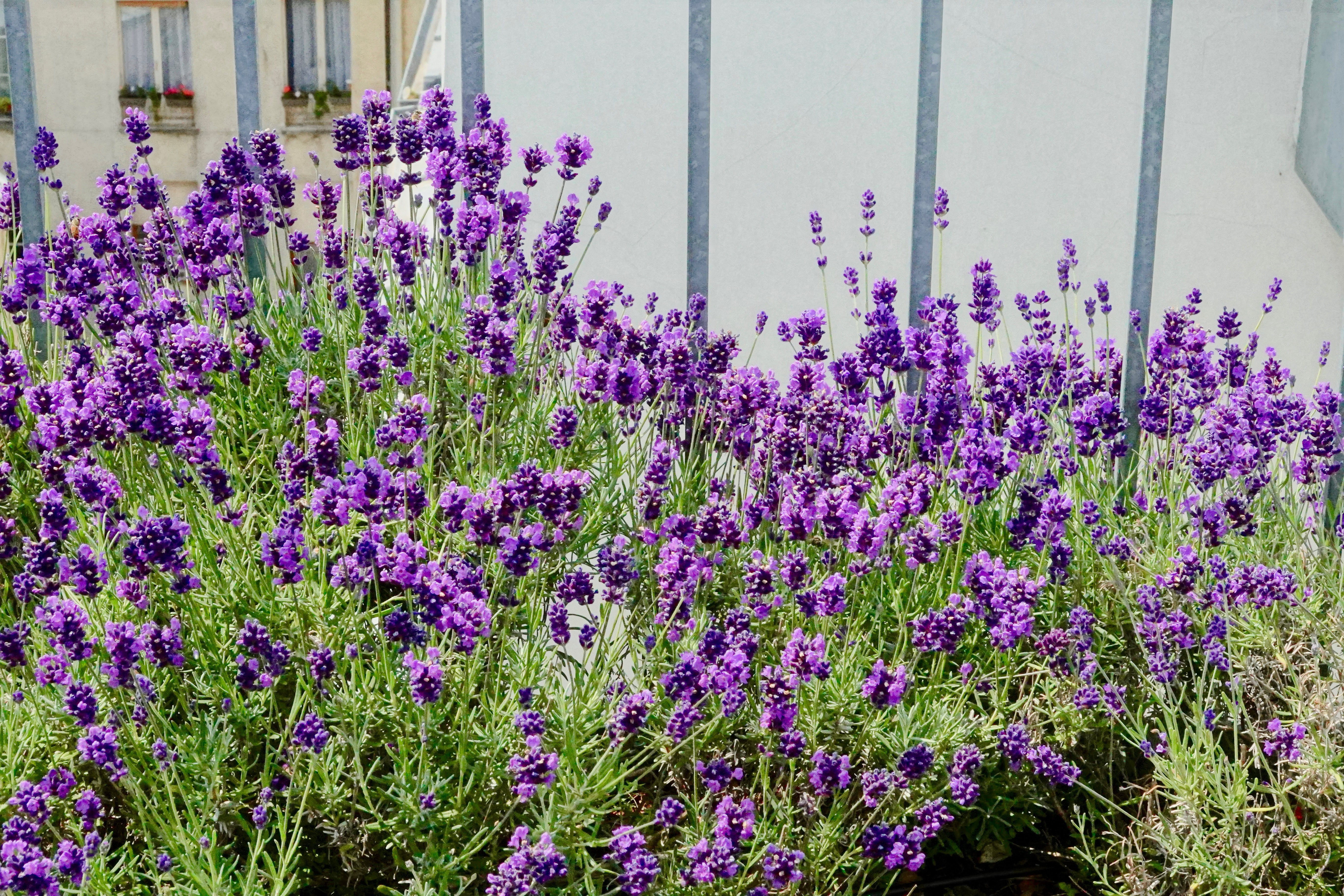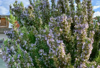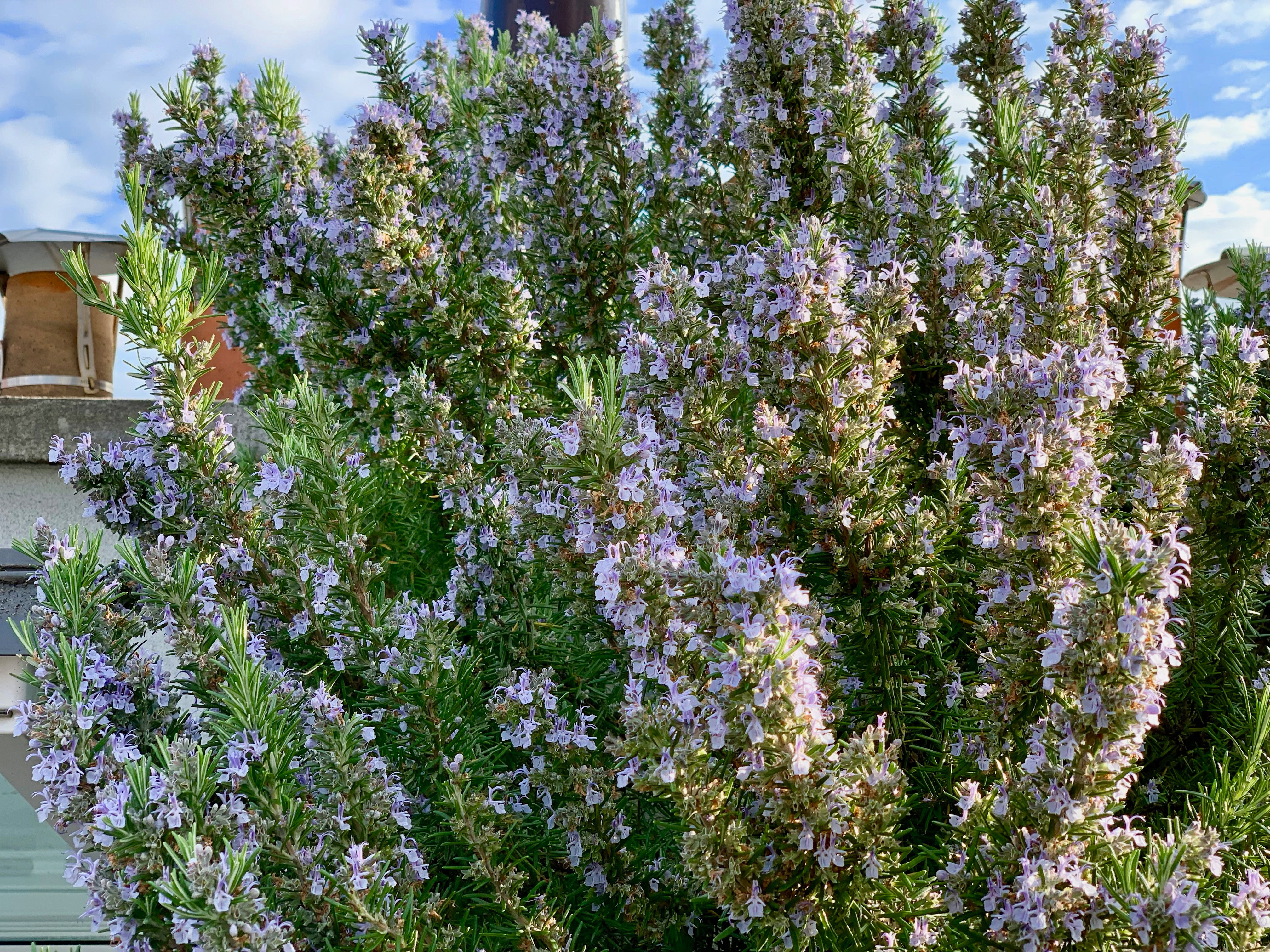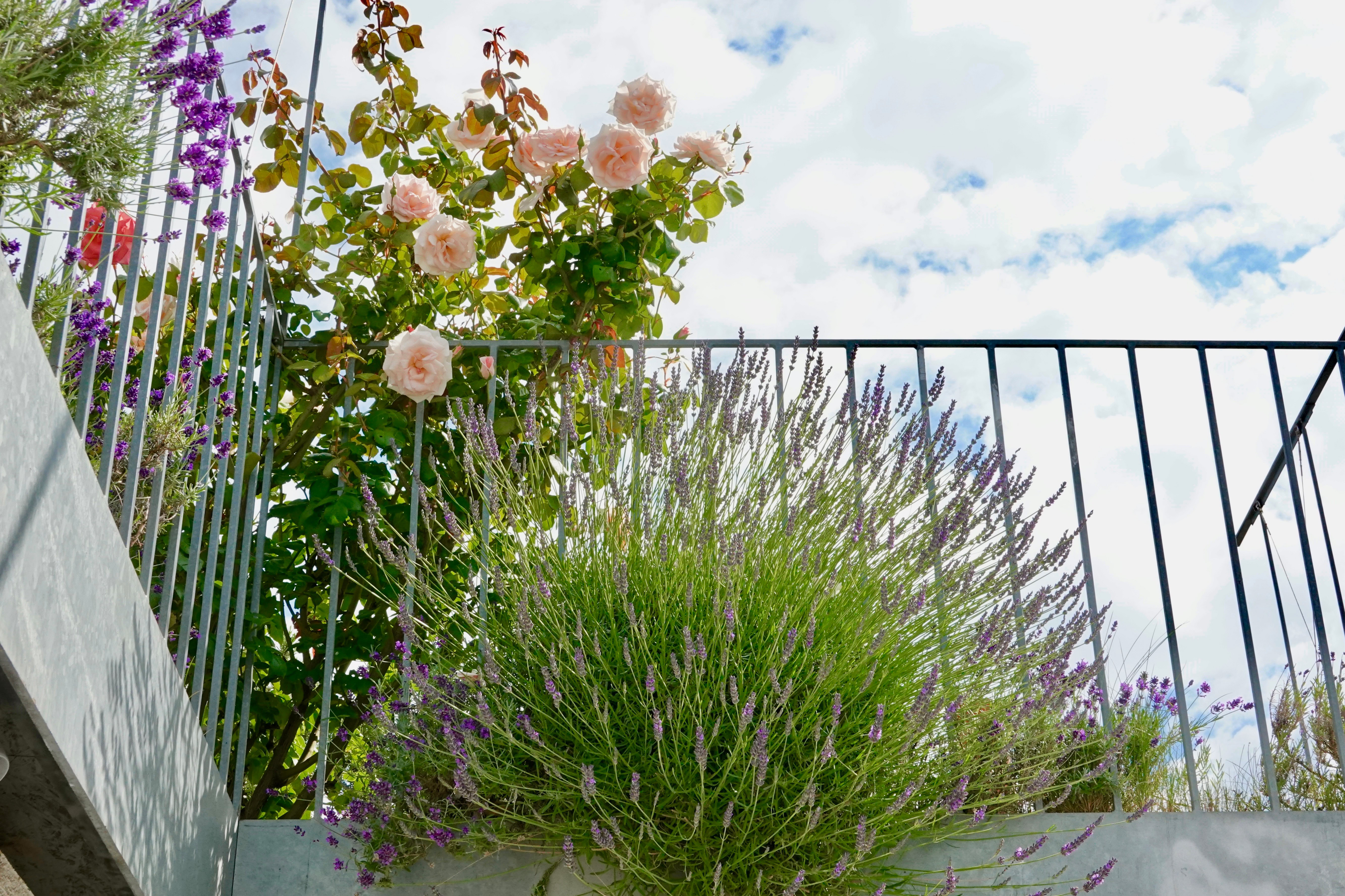 Ein Band von Lavendel umzieht den Rand der Terrasse. An der Pergola rankt eine zweifarbige Kletterrose und gegenüber eine Weinrebe. Himbeeren, Stachelbeeren und Johannisbeeren, ein Rosmarin-Monster und zahlreiche Kräuter gedeihen ebenfalls und werden über ein im Boden verlegtes Bewässerungssystem bewässert.