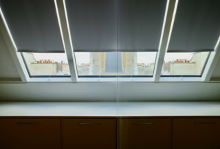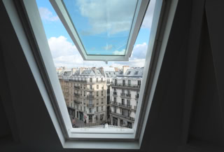 Die großen Fenster bieten einen Blick auf den Boulevard und über die Dächer der Stadt. In Abstimmung mit der Denkmalpflege wurde die Struktur des alten Daches aus Zinkblech aufgenommen und neu interpretiert. Eine 3-fach-Isolierverglasung mit Schall- und Wärmeschutzgläsern und nanostrukturierter Oberfläche wechselt mit geschlossenen Elementen aus Vakuumdämmung mit Zinkblechkaschierung.