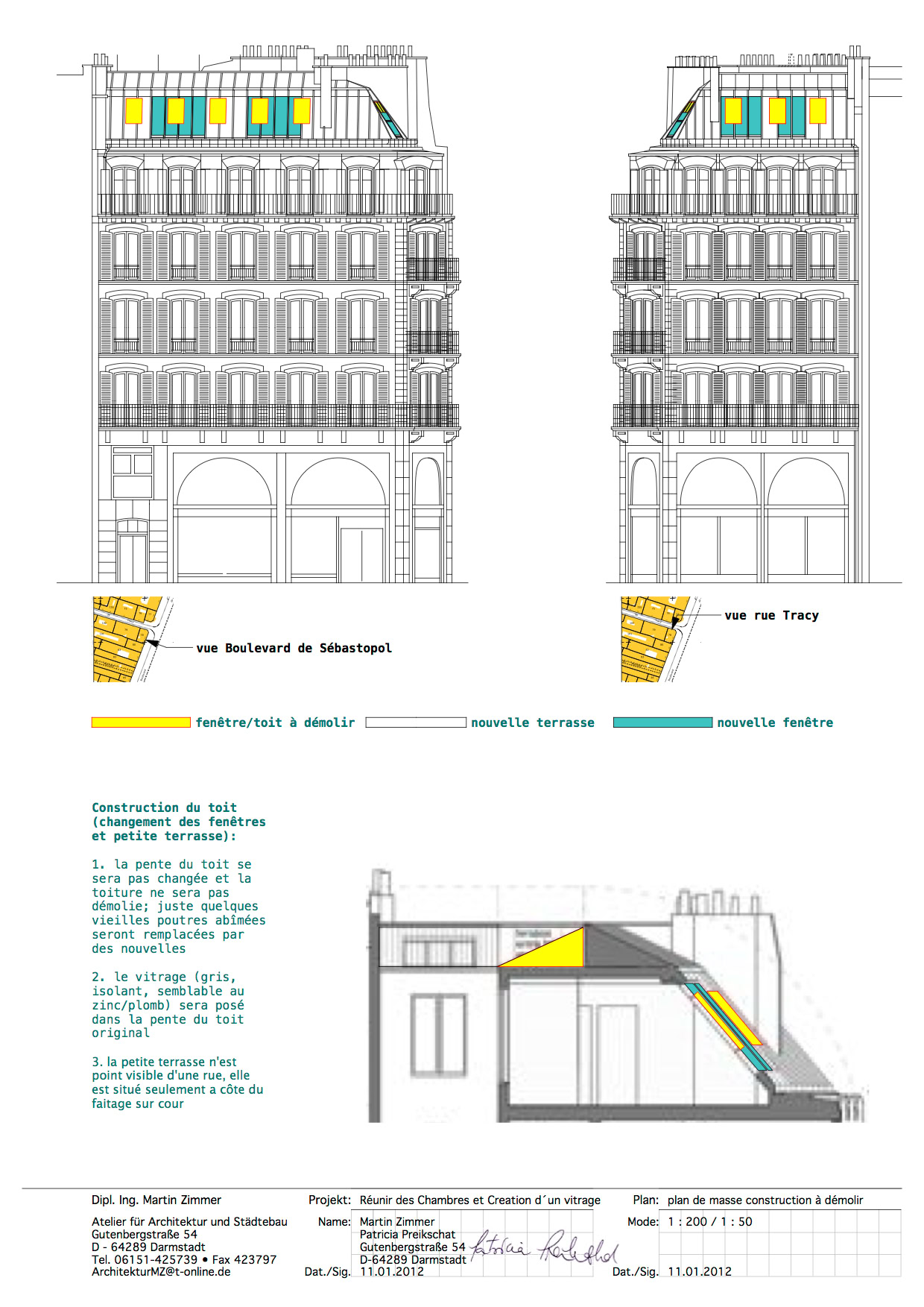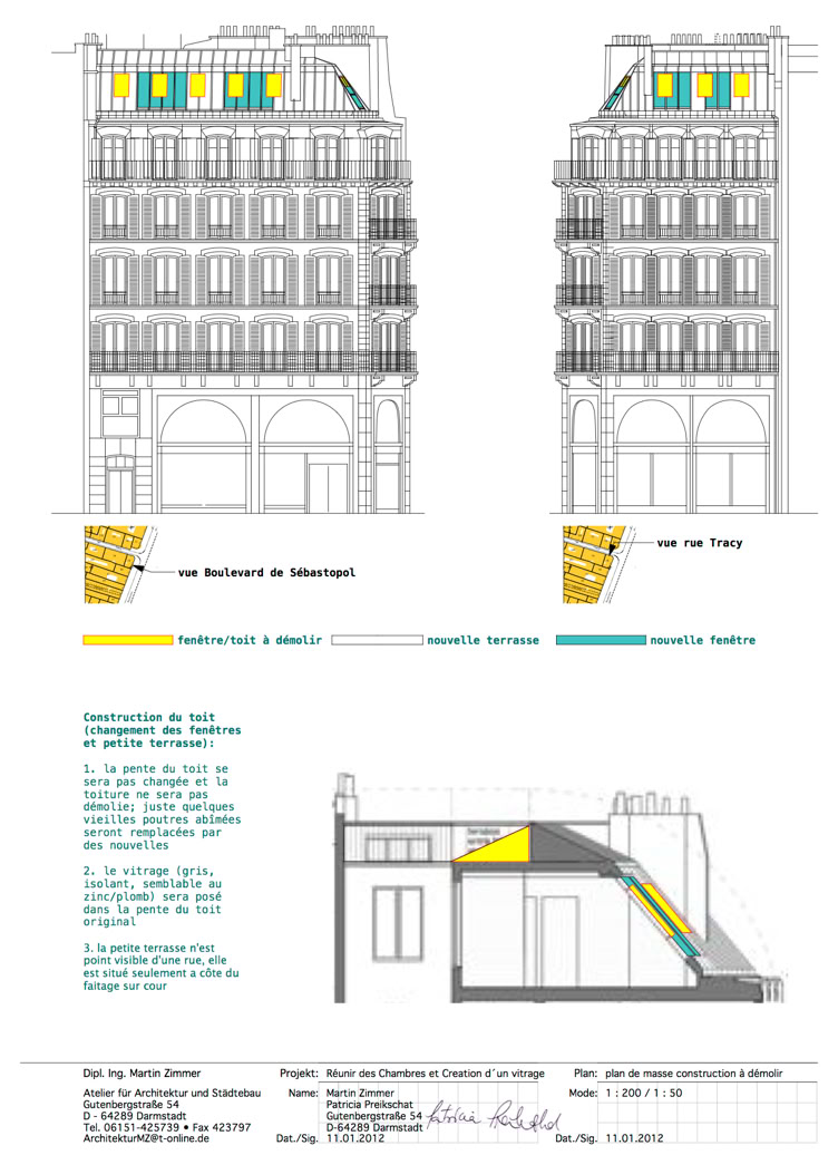 Der gebaute Entwurf ist das Ergebnis von sieben Jahren Ringen mit dem Bauamt von Paris, der positiv eingestellten Denkmalpflege (architectes des bâtiments de France) und der schwerfälligen CVP (commission du vieux Paris). Nach Einreichen des Bauantrags musste dieser unerwartet geändert werden („könnte ja das Stadtbild von Paris beeinflussen“), bis zur Genehmigung verging über ein ganzes Jahr.