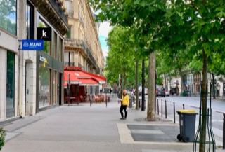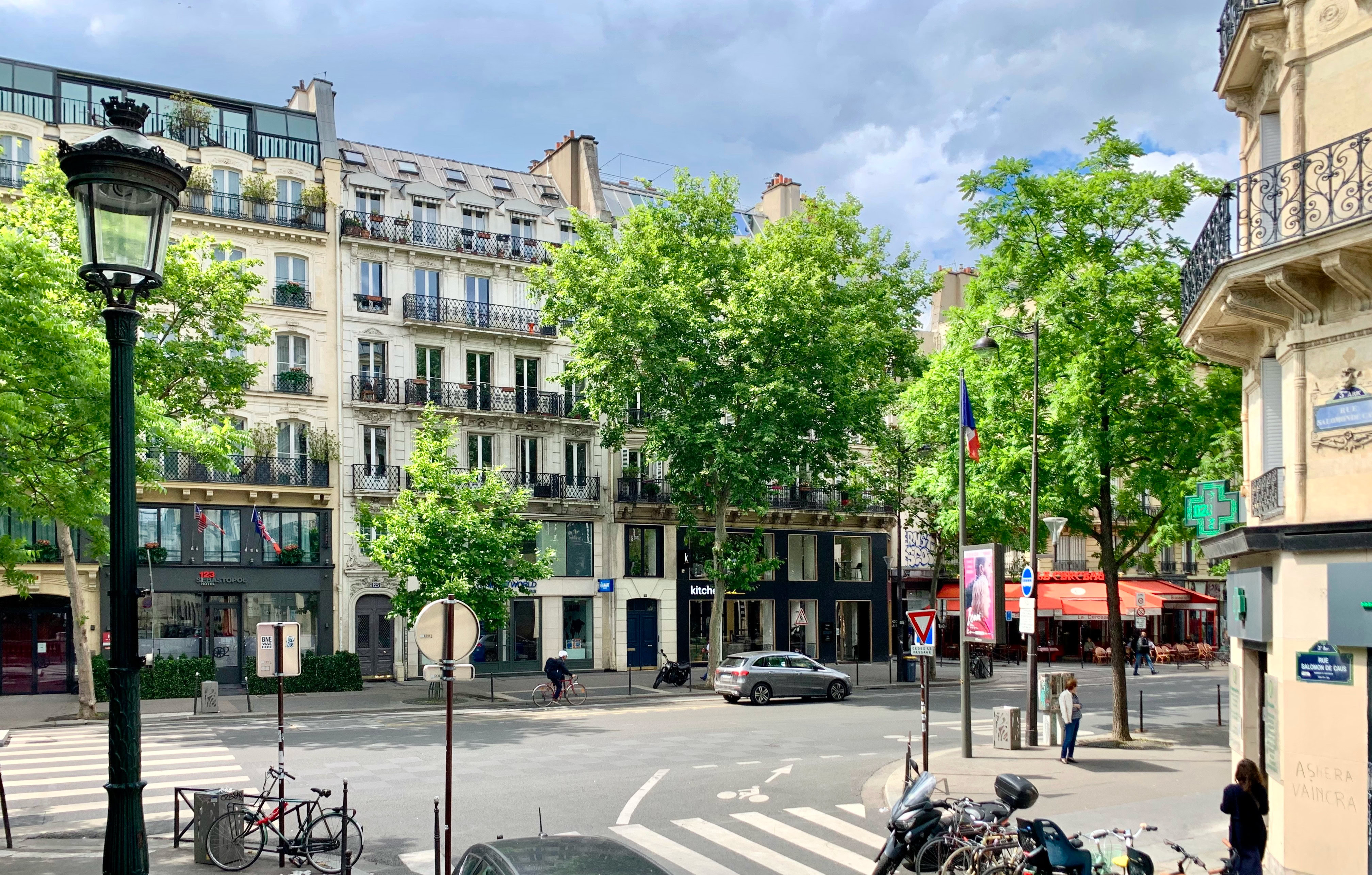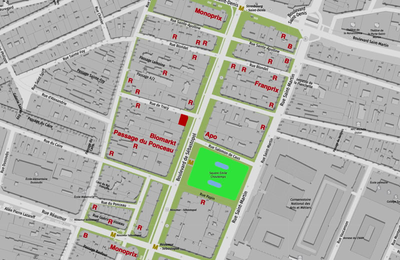 Direkt gegenüber liegt eine Apotheke, zwei Häuser weiter der Biomarkt „La Vie Claire“ der nächste große gut ausgestattete Supermarkt „Monoprix“ ist 150m entfernt, ein „Franprix“ ist 120m entfernt. Bäckereien (B) sind ebenfalls fußläufig erreichbar.