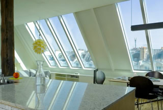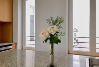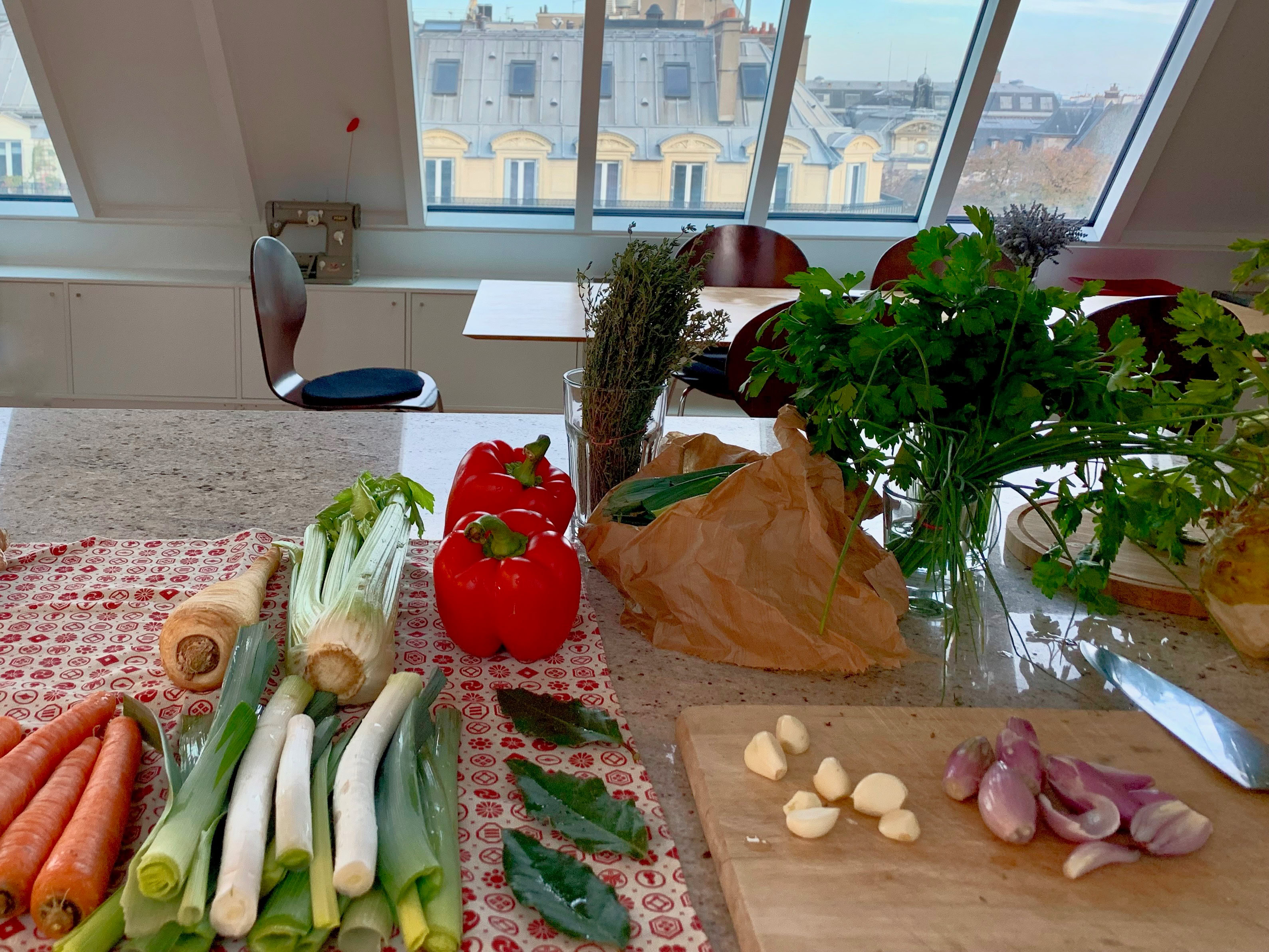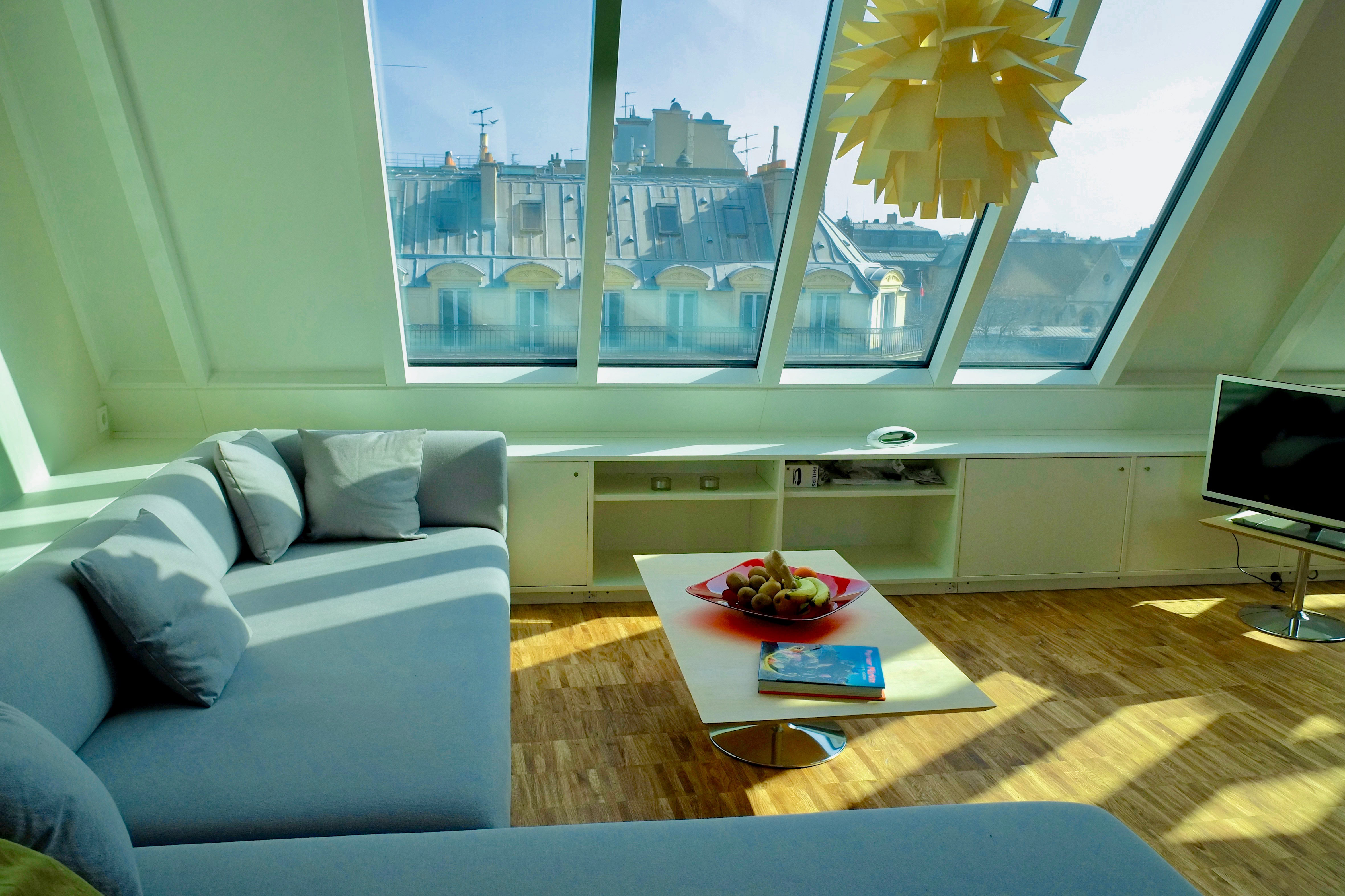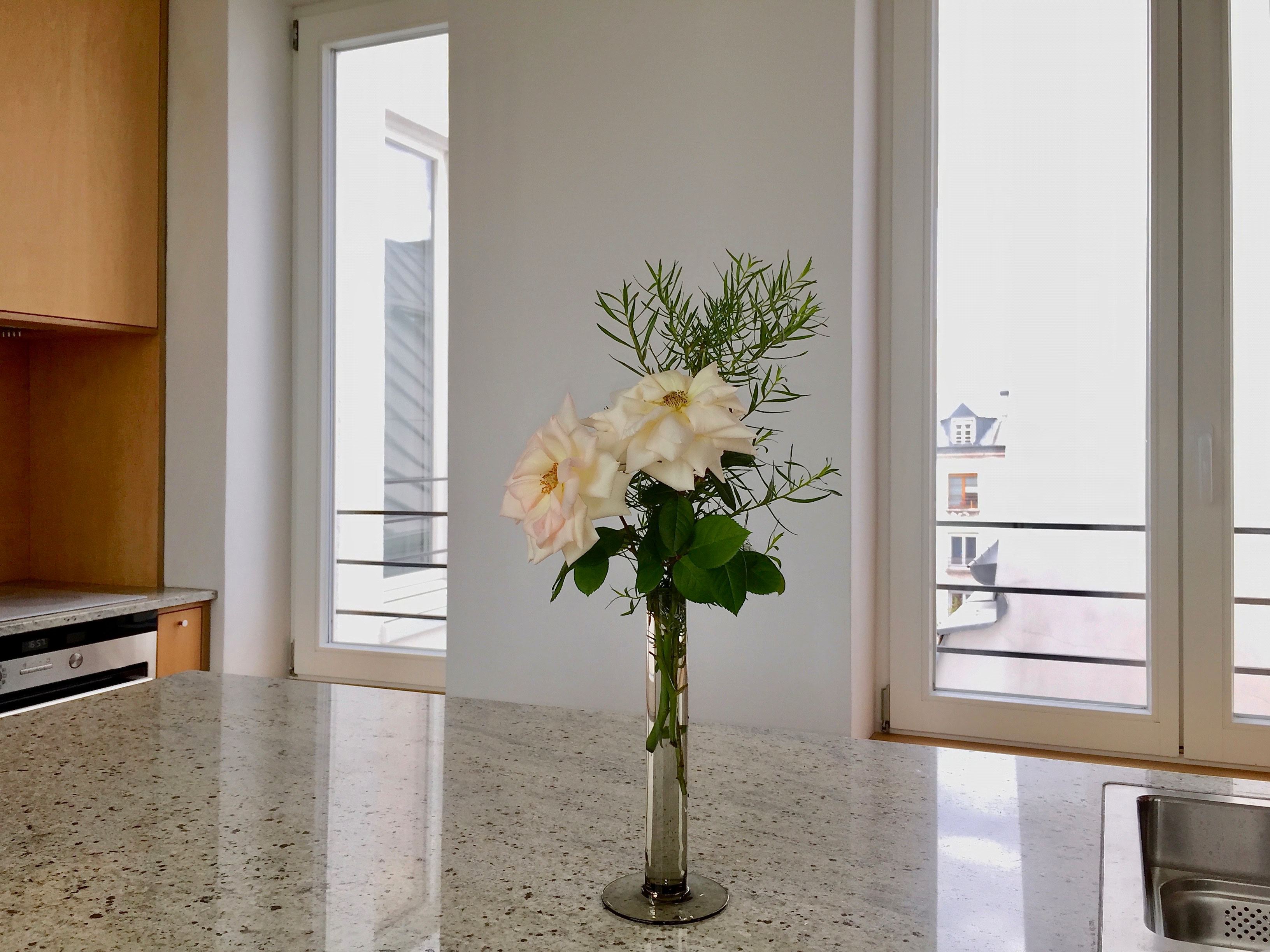 Am Küchenarbeitsplatz arbeitet man mit Rundblick über die Wohnung und die Dächer von Paris. Zum Kochen steht sogar speziell gefiltertes Wasser zur Verfügung.