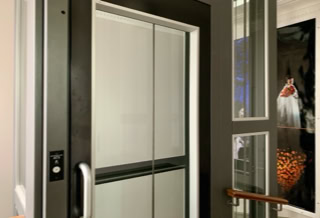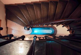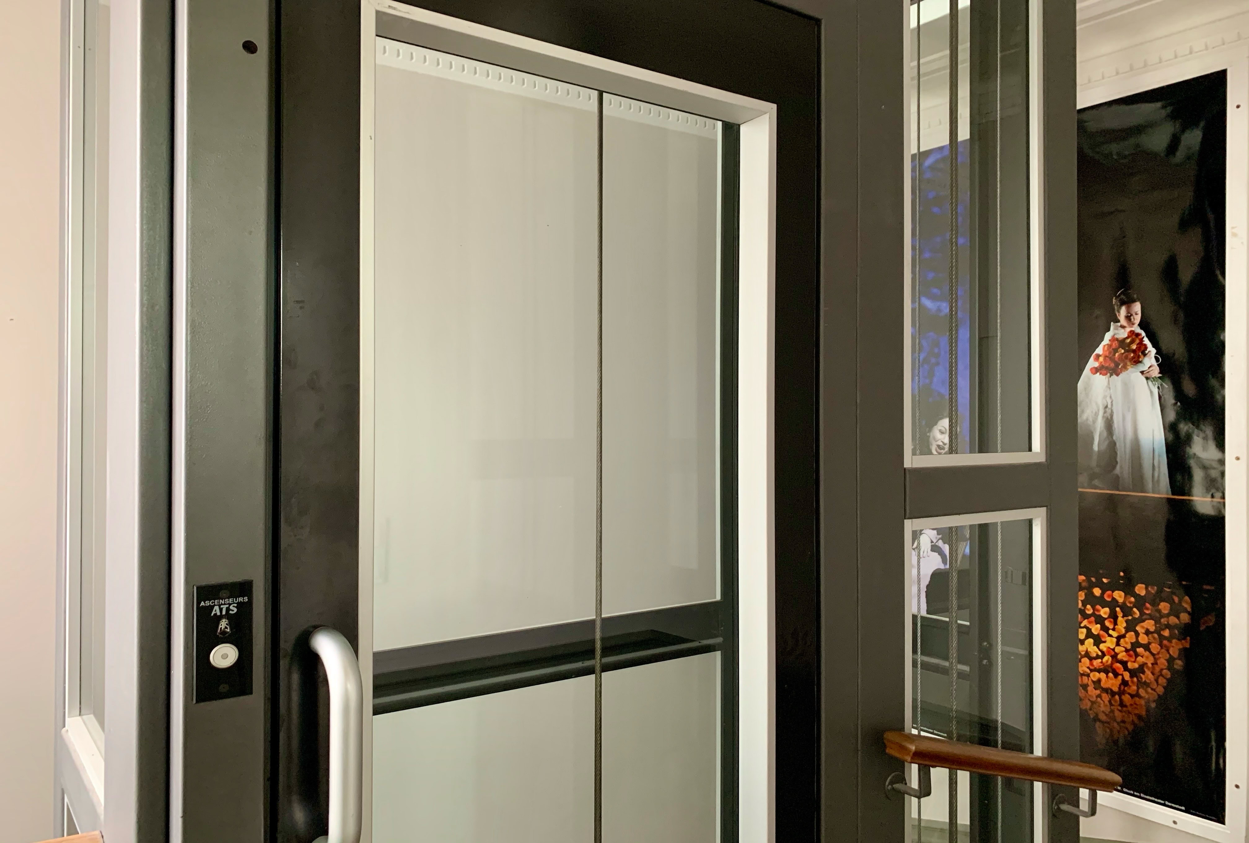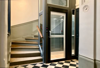 Der Aufzug ist dreiseitig verglast und wirkt dadurch hell und nicht beklemmend, obwohl er ganz schmal gebaut ist und in das erweiterte Treppenauge eingefügt wurde.
