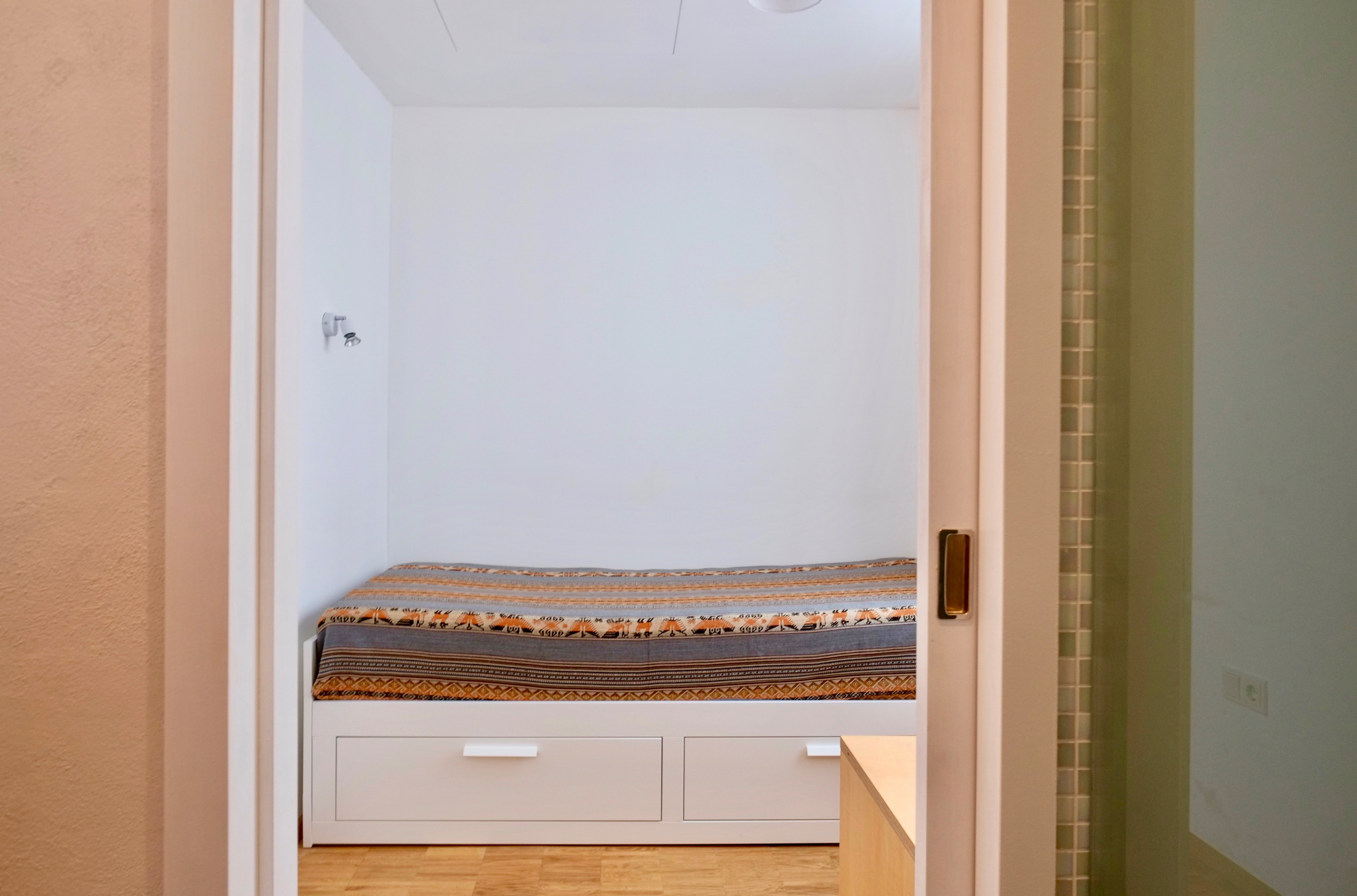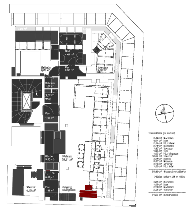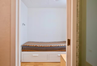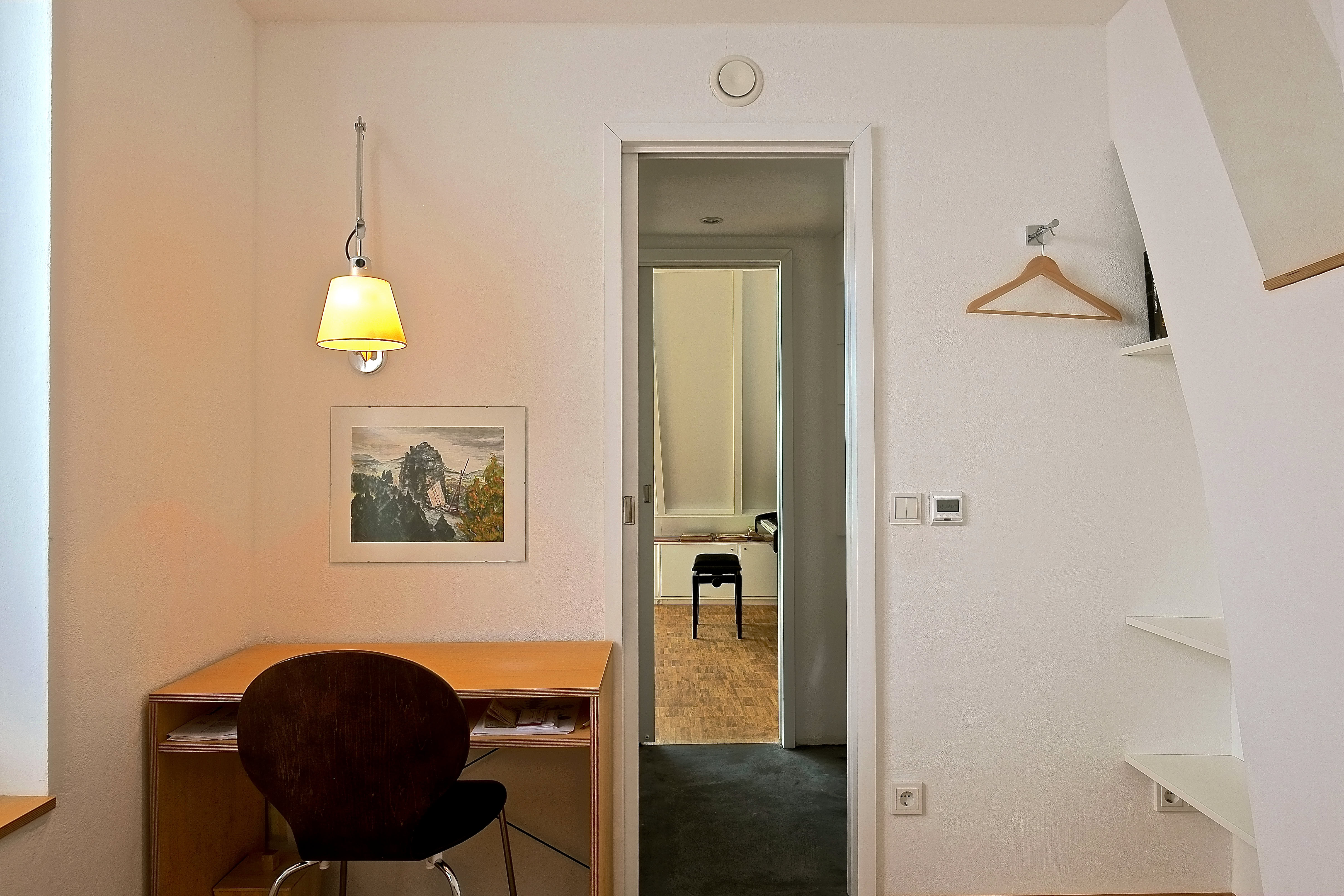 Zum Hof hin lieg das kleine Gästezimmer, in dem über ein Auszugsbett 80(160)x200cm Platz für maximal Zwei zum Schlafen ist. Es ist alternativ ein Raum der Ruhe und Konzentration, ideal zum ungestörten Arbeiten. Dank W-Lan ist man auch hier jederzeit mit der Welt verbunden.