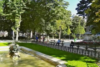 Zwei neobarocke Brunnen bilden das Herz der Parkanlage. Neben einem Bouleplatz, Tischtennisplatten und einem Kinderspielplatz laden Bänke zum Verweilen ein.