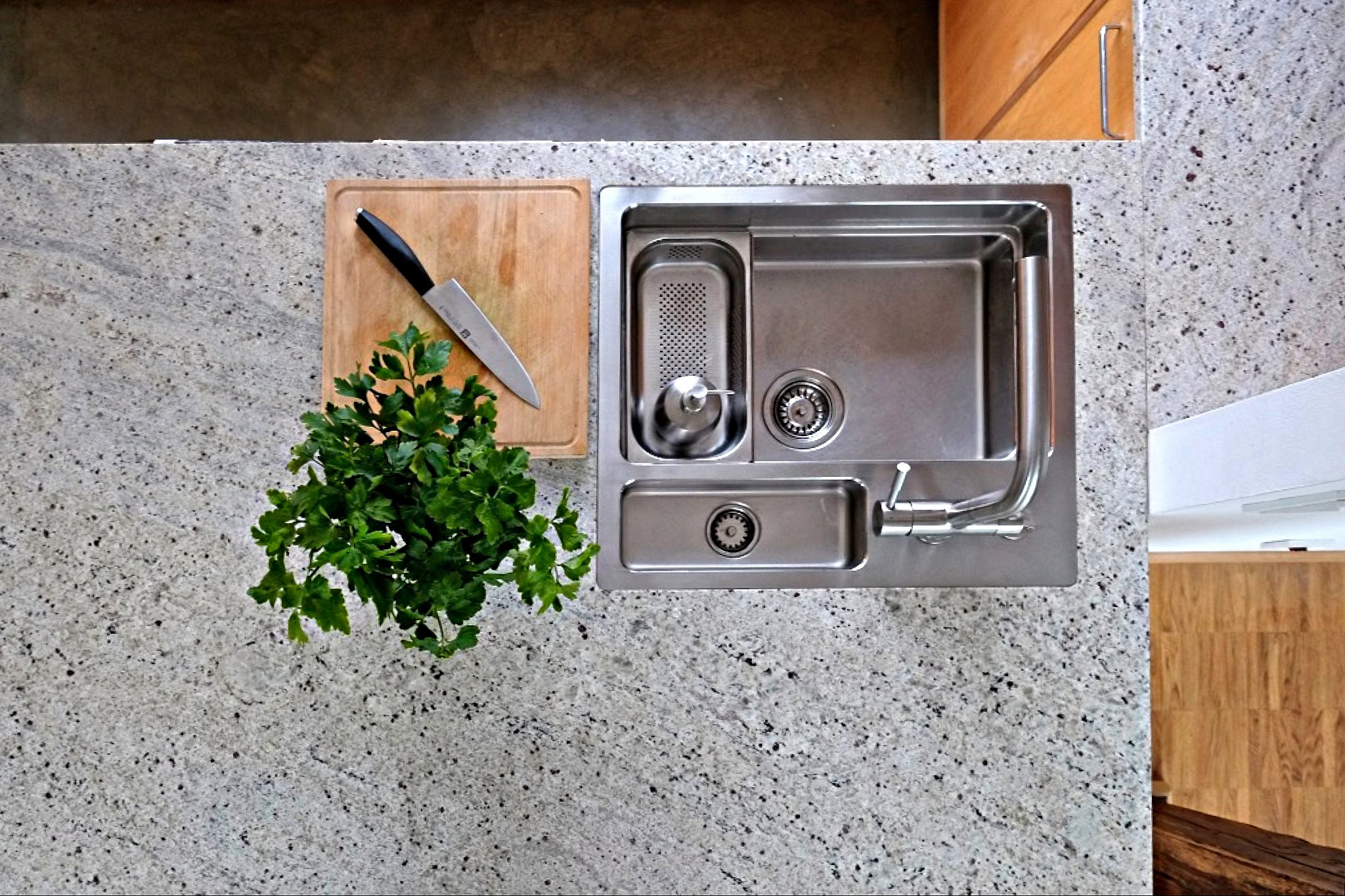 Die helle Granitplatte dient als durchgehende Arbeitsfläche, in die die großzügige Designerspüle flächenbündig integriert ist.