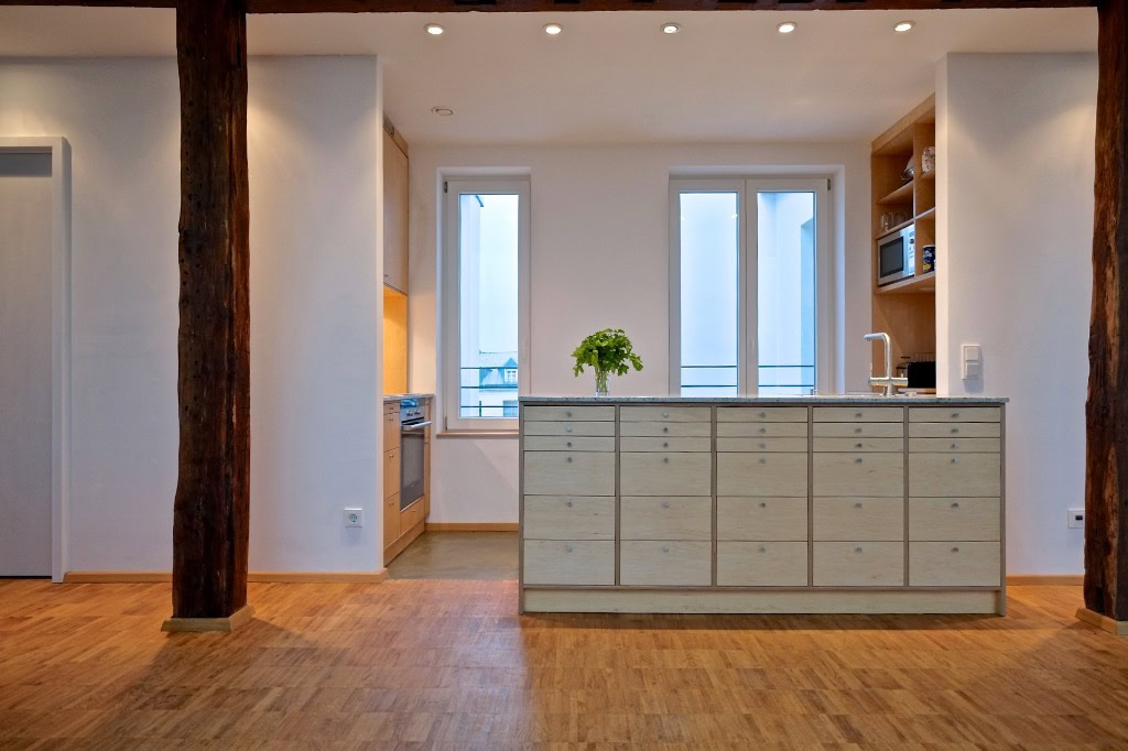 Durch die raumhohen Panoramafenster ist der Salon hell und lichtdurchflutet. Morgens spielt die Sonne auf dem warmen Parkettboden, abends fällt das Licht über die Küchenfenster in den Raum. Edle Materialien wie die Granitplatte des Küchenblockes und die Ahornoberfläche der Möbel kontrastieren mit den schlichten hellen Einbauschränken und Wänden.