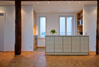Hauptraum der knapp 70 m2 großen Wohnung ist der große Salon mit einer offenen Küche. Dieser Raum, um den sich die Zimmer gruppieren, ist das Zentrum der Wohnung. Von hier aus hat man einen herrlichen Ausblick auf den Boulevard, die Parkanlage und auf die Dächer des Hinterhofes.