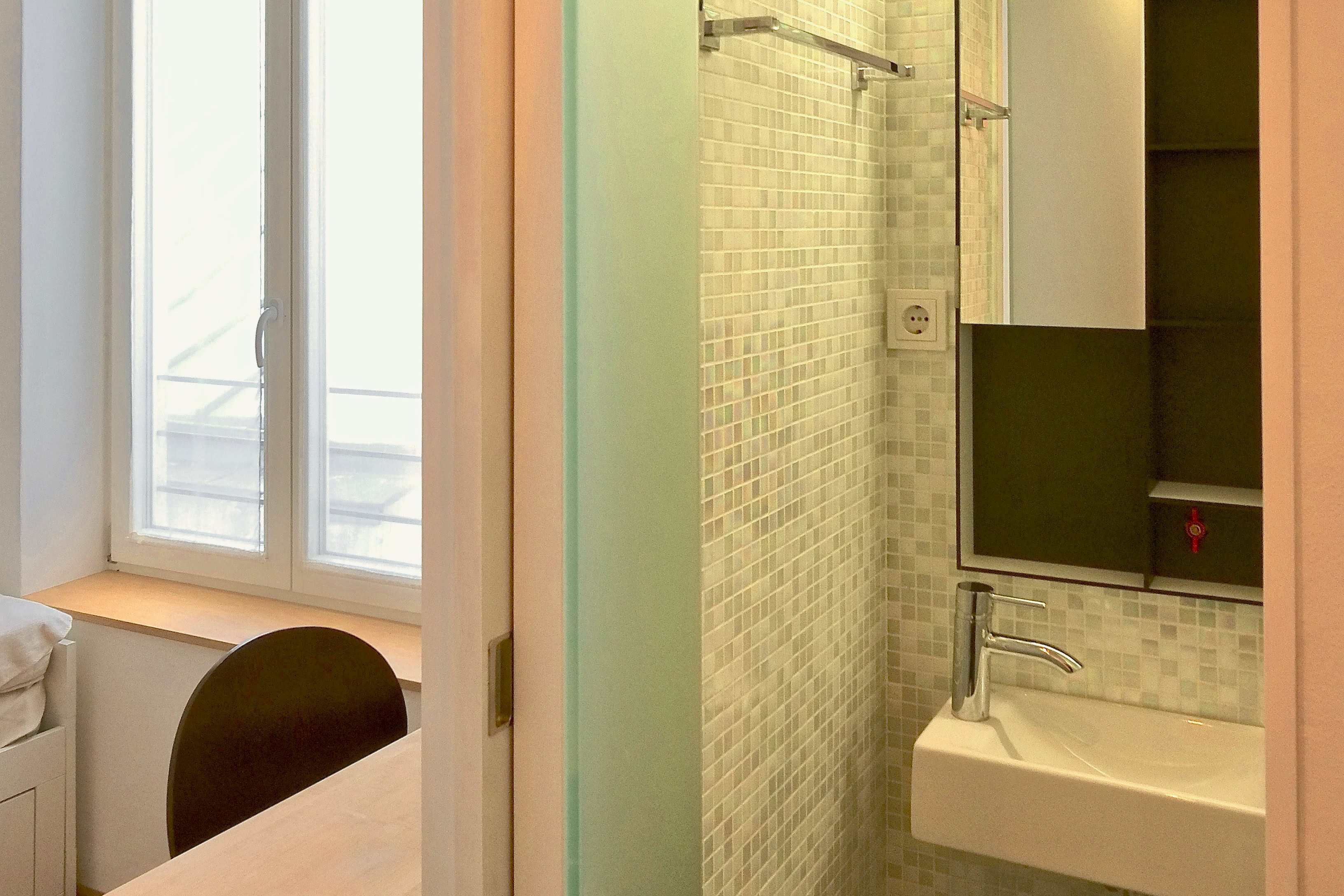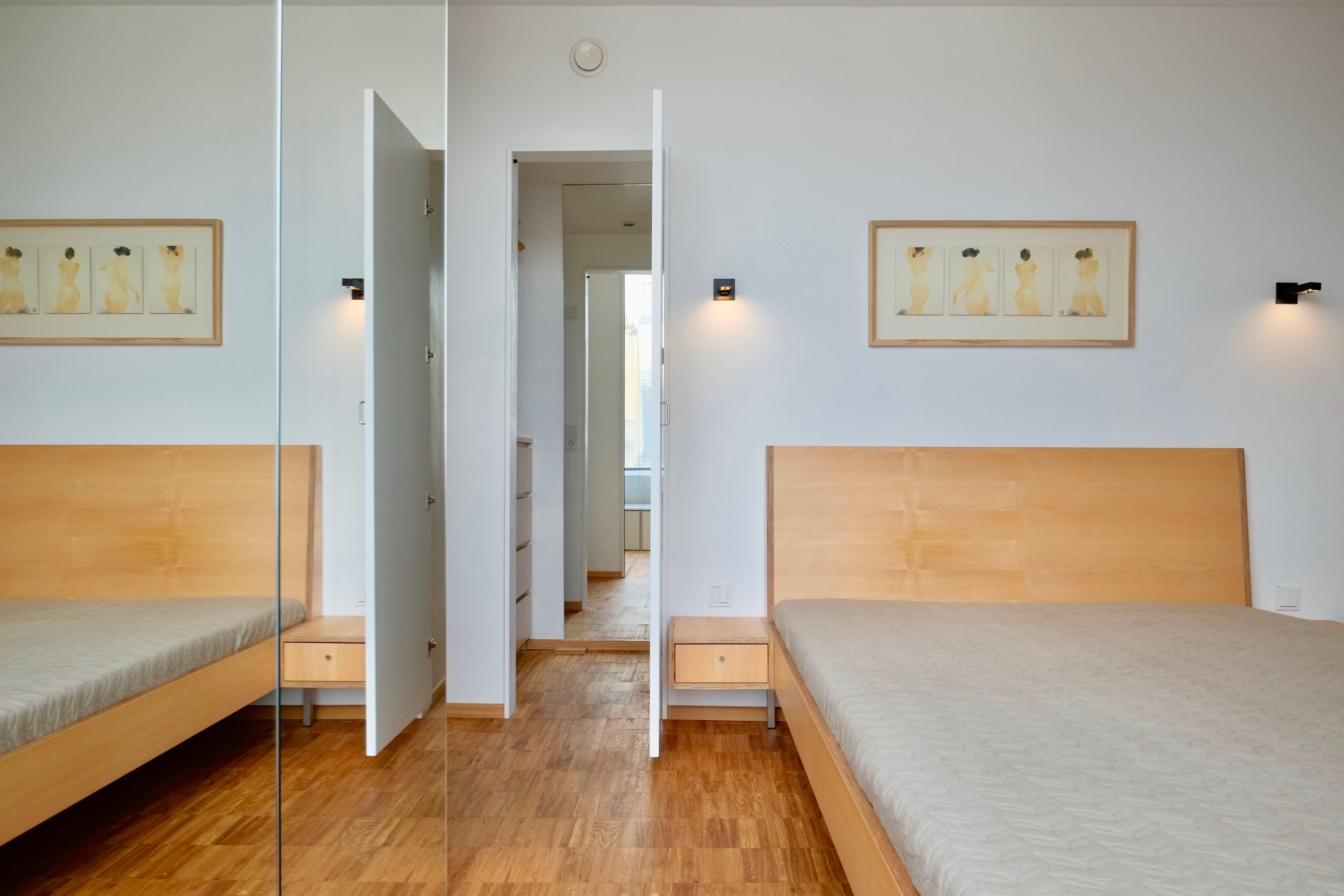 Auch mitten in Paris an einer bedeutenden Achse lässt es sich ruhig schlafen. Das Schlafzimmer liegt an der zur Fußgängerzone gehörenden Rue Tracy und ist durch die schallgeschützten Panoramafenster hell und freundlich. Die Spiegelwand zum Bad hin vergrößert den Raum optisch.