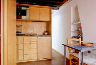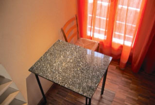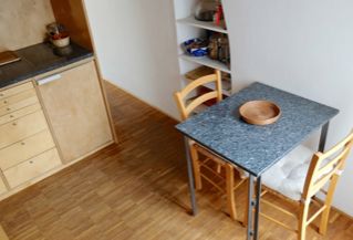 Betritt man das kleine Studio, so hat man einen Eingangsbereich mit Garderobenschrank und den Zugang zum Bad auf der Linken, den Esstisch mit massiver Granitplatte auf der Rechten Seite. Hier scheint die Morgensonne durch ein großes Fenster zum Innenhof herein.