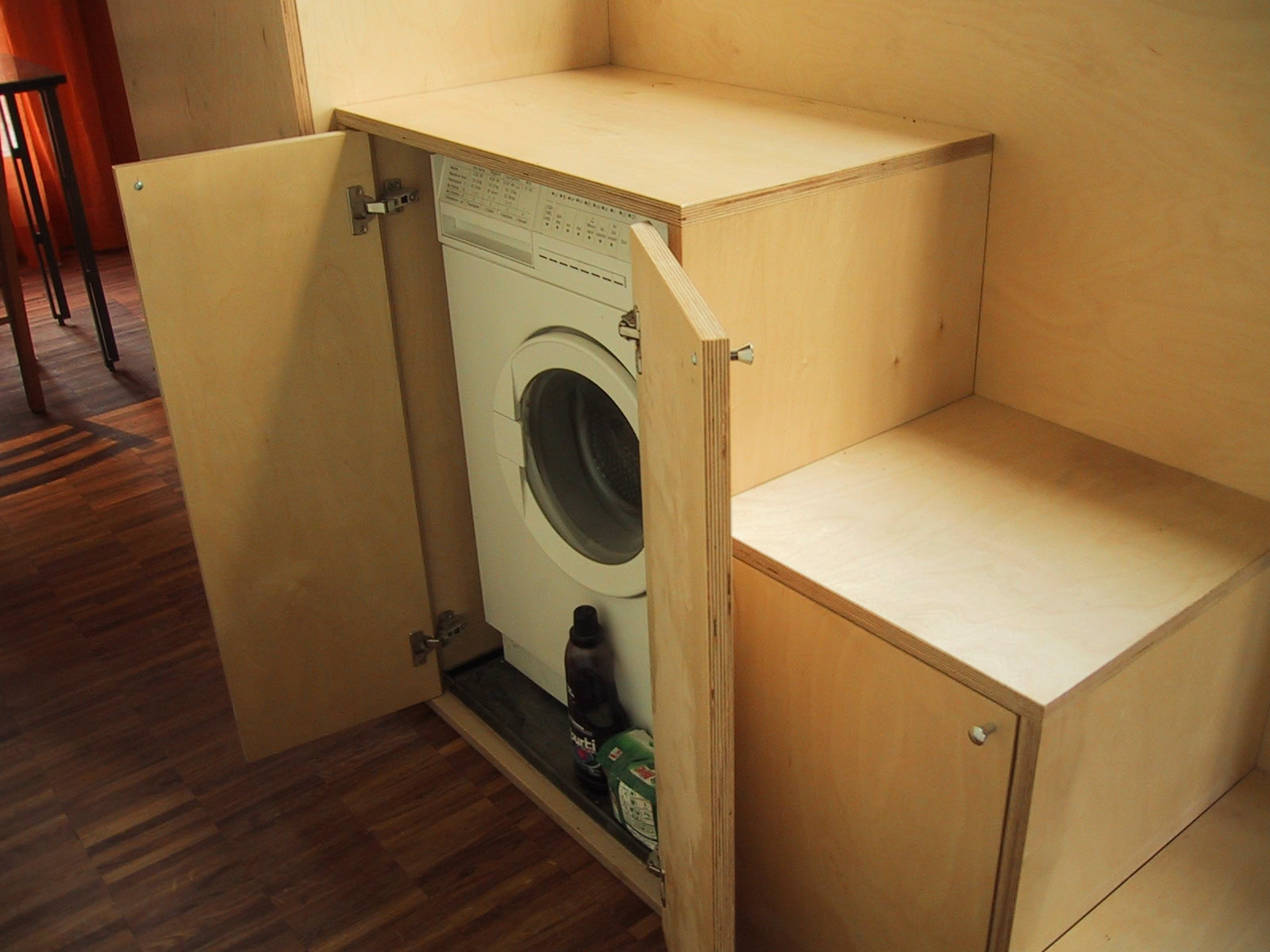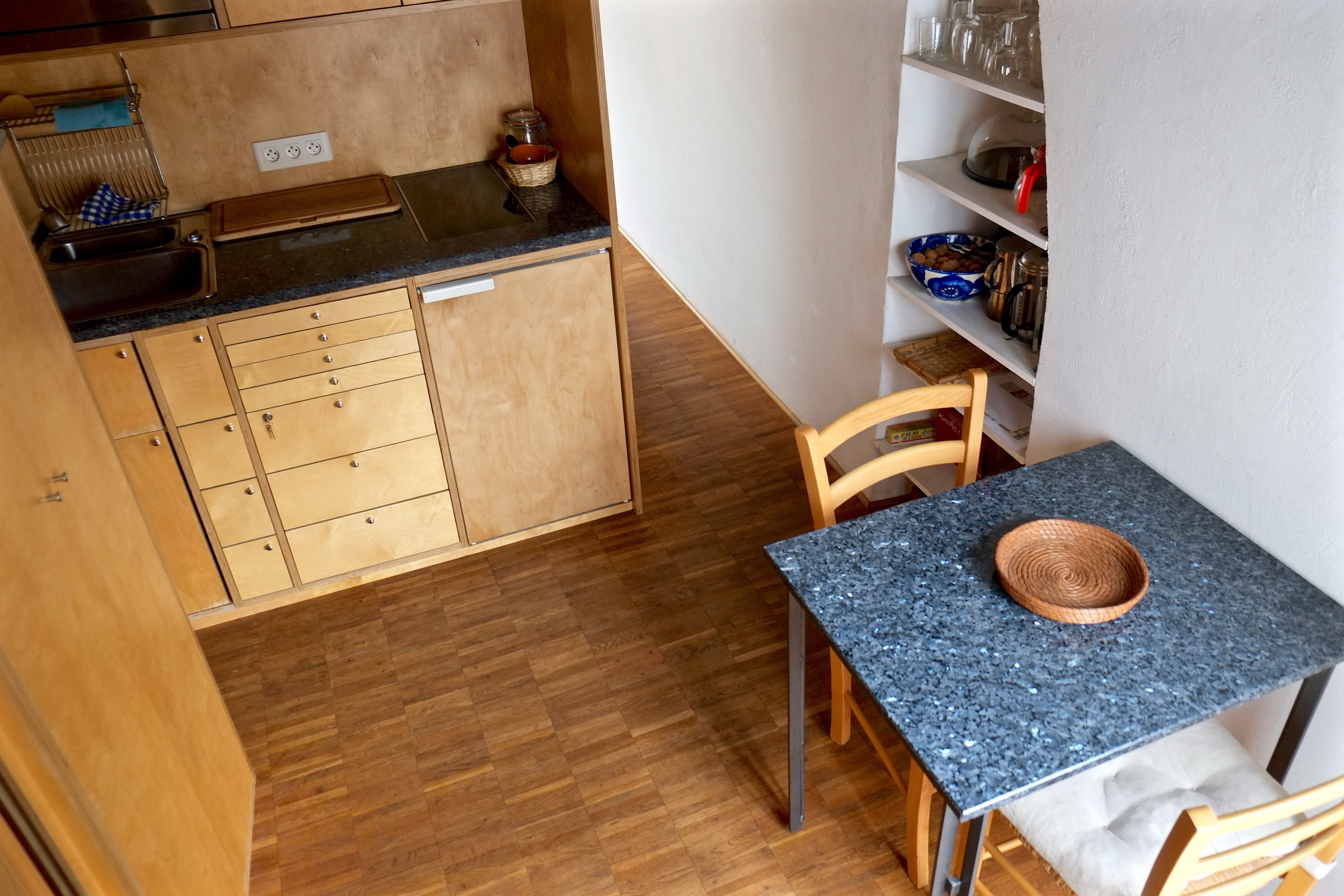Die Küche ist mit einem Kühlschrank, zwei Induktionsplatten sowie mit einem Kombigerät mit Mikrowelle, Grill, Umluft und Ober/Unterhitze ausgestattet, ebenso Töpfe, Gläser, Gedecke und Besteck. Ein Waschtrockner ist auch vorhanden.