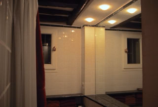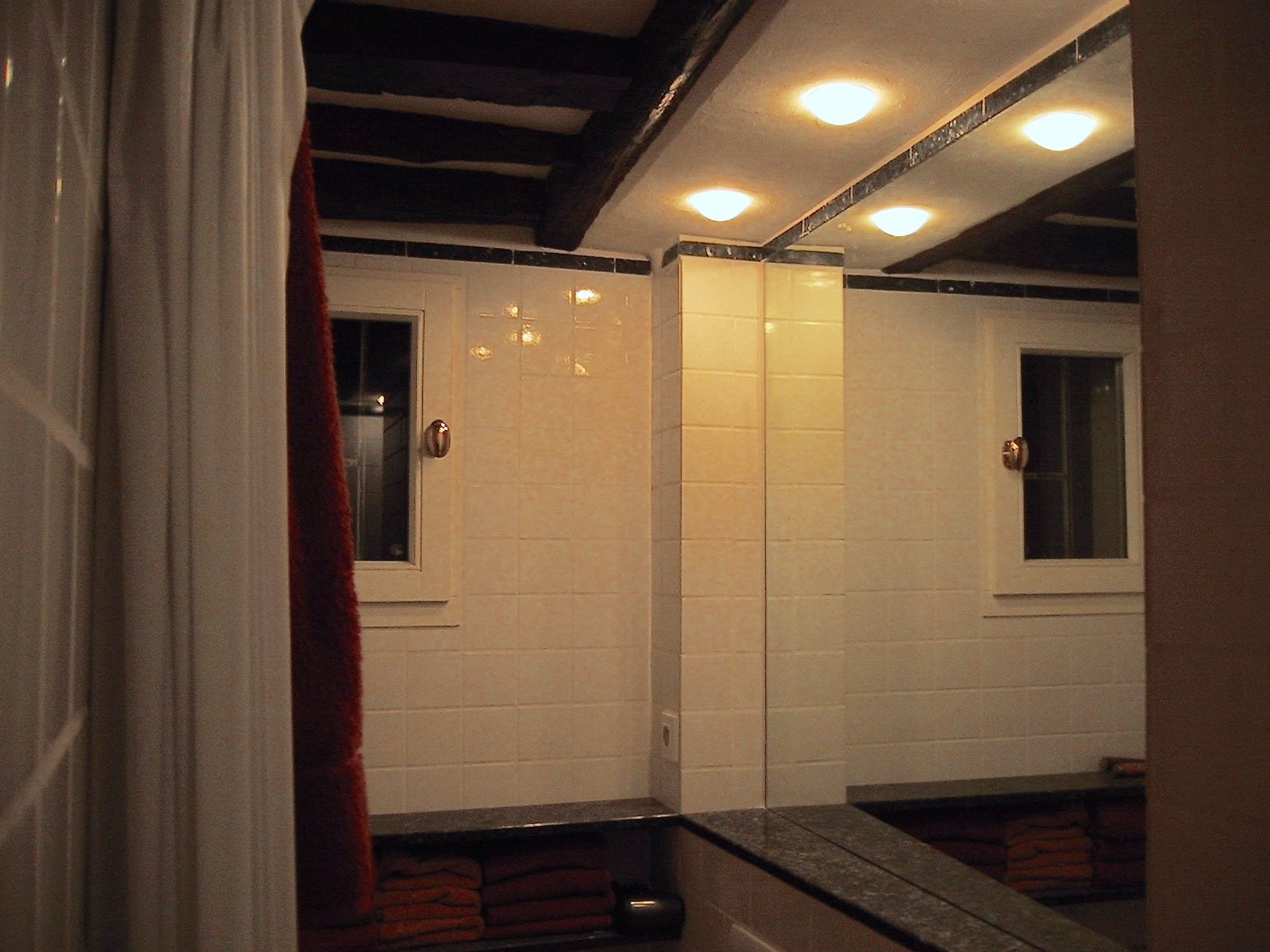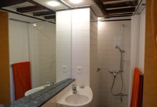 Das kleine Bad wirkt großzügig durch den großen deckenhohen Spiegel und die Granit-Bodenplatte aus einem Stück, die sich in der bodengleichen Dusche fortsetzt.