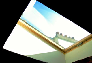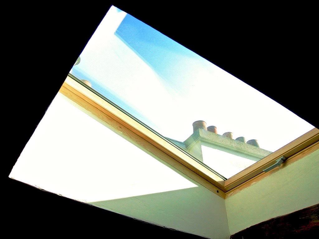 Der Küchenblock ist als frei im Raum stehender Raumteiler gebaut. Auf der Rückseite befindet sich das Bett über den großen ausziehbaren Unterschränken. Aus dem Bett sieht man über ein großes helles Dachfenster direkt in den Himmel und bei Nacht in die Sterne über Paris.