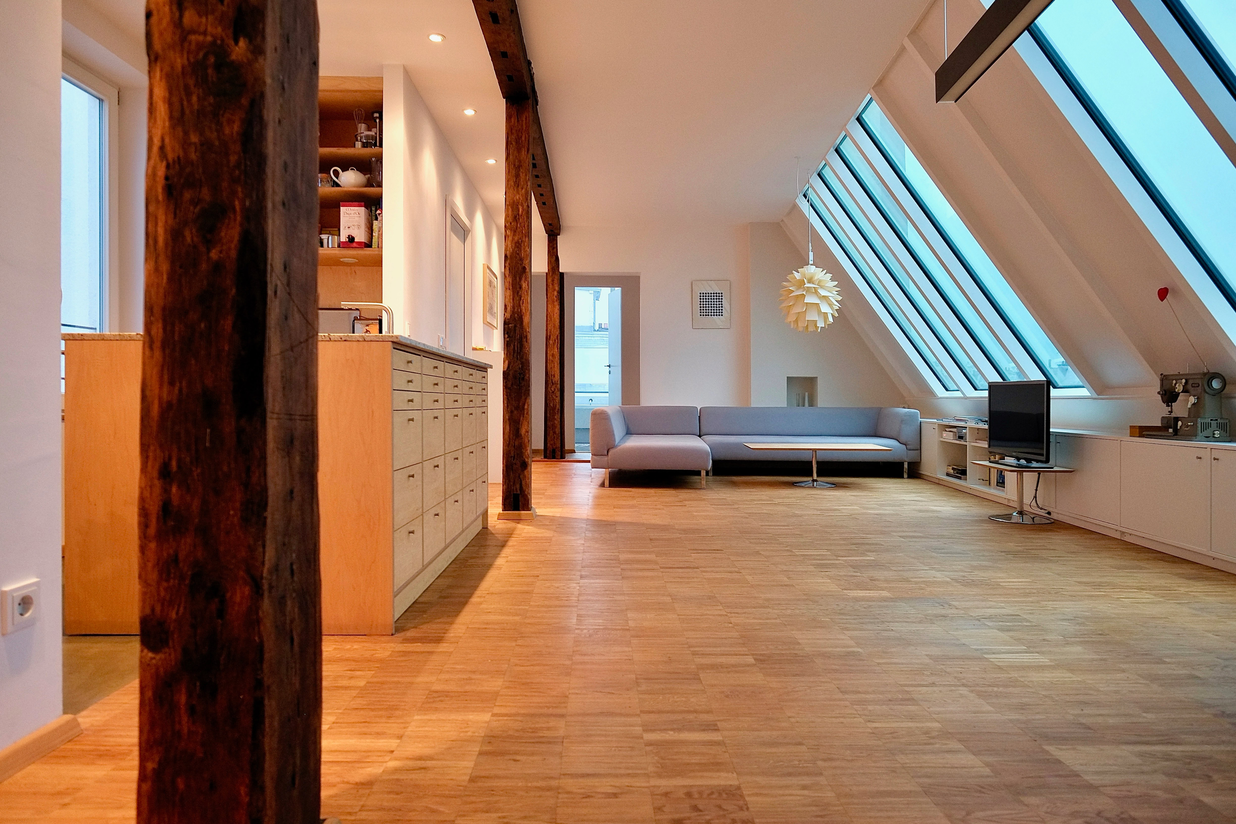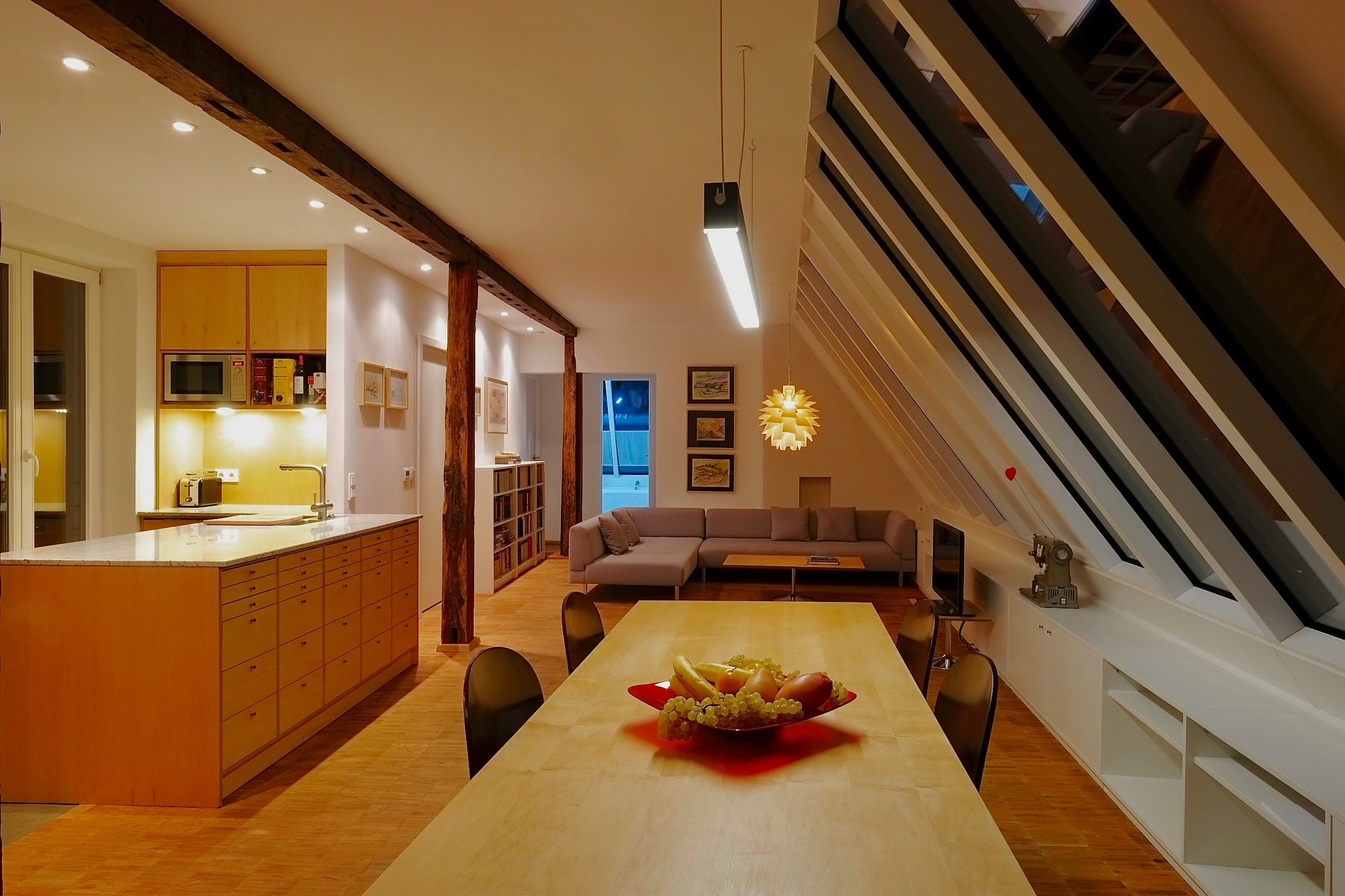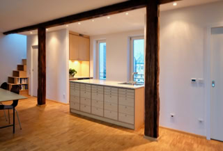 Die alten Stützen und Deckenbalken aus Eichenholz und unterstreichen die Längsausrichtung des Raumes. Im Wohnbereich erzeugen Einzelleuchten ein angenehmes Licht, im Bewegungsbereich und über der Küchenarbeitsplatte sorgen Deckeneinbaustrahler für Helligkeit.