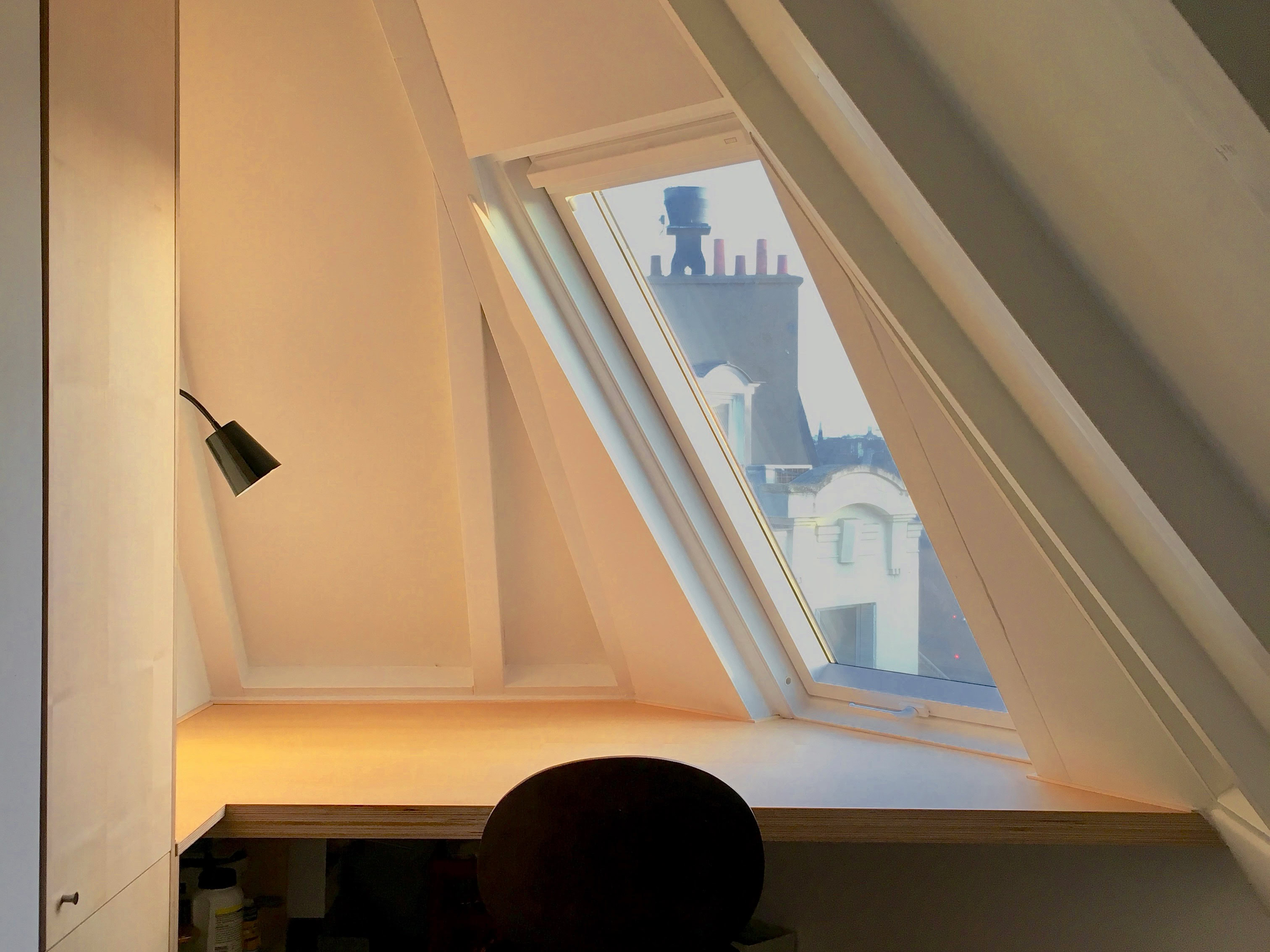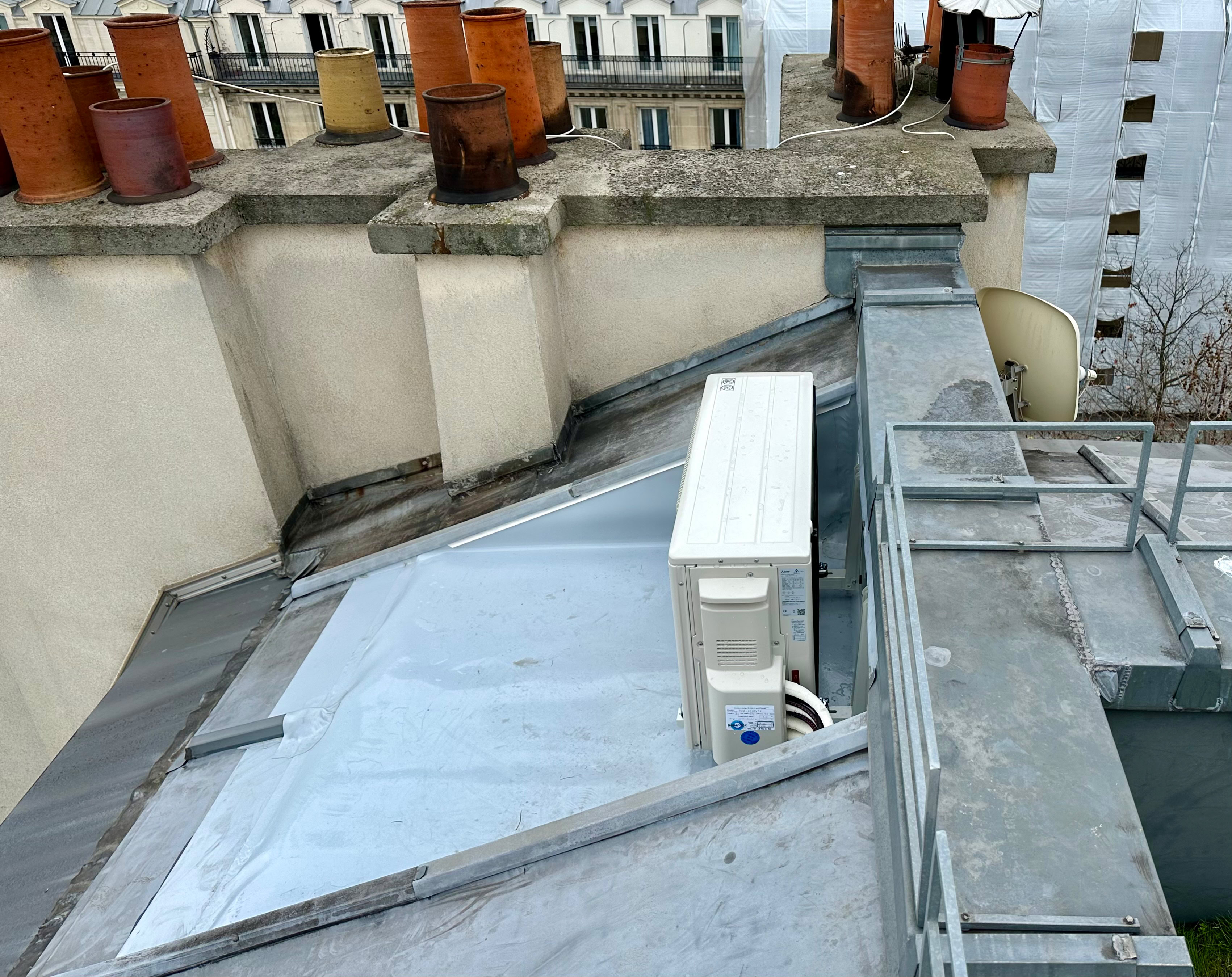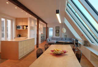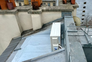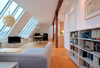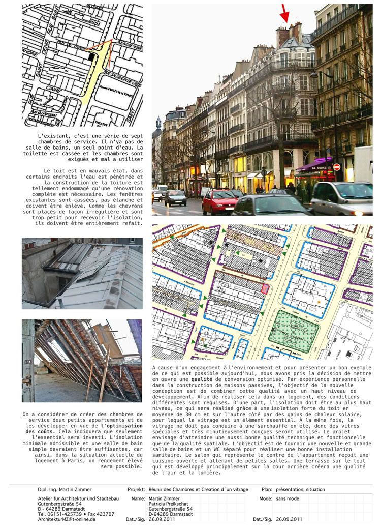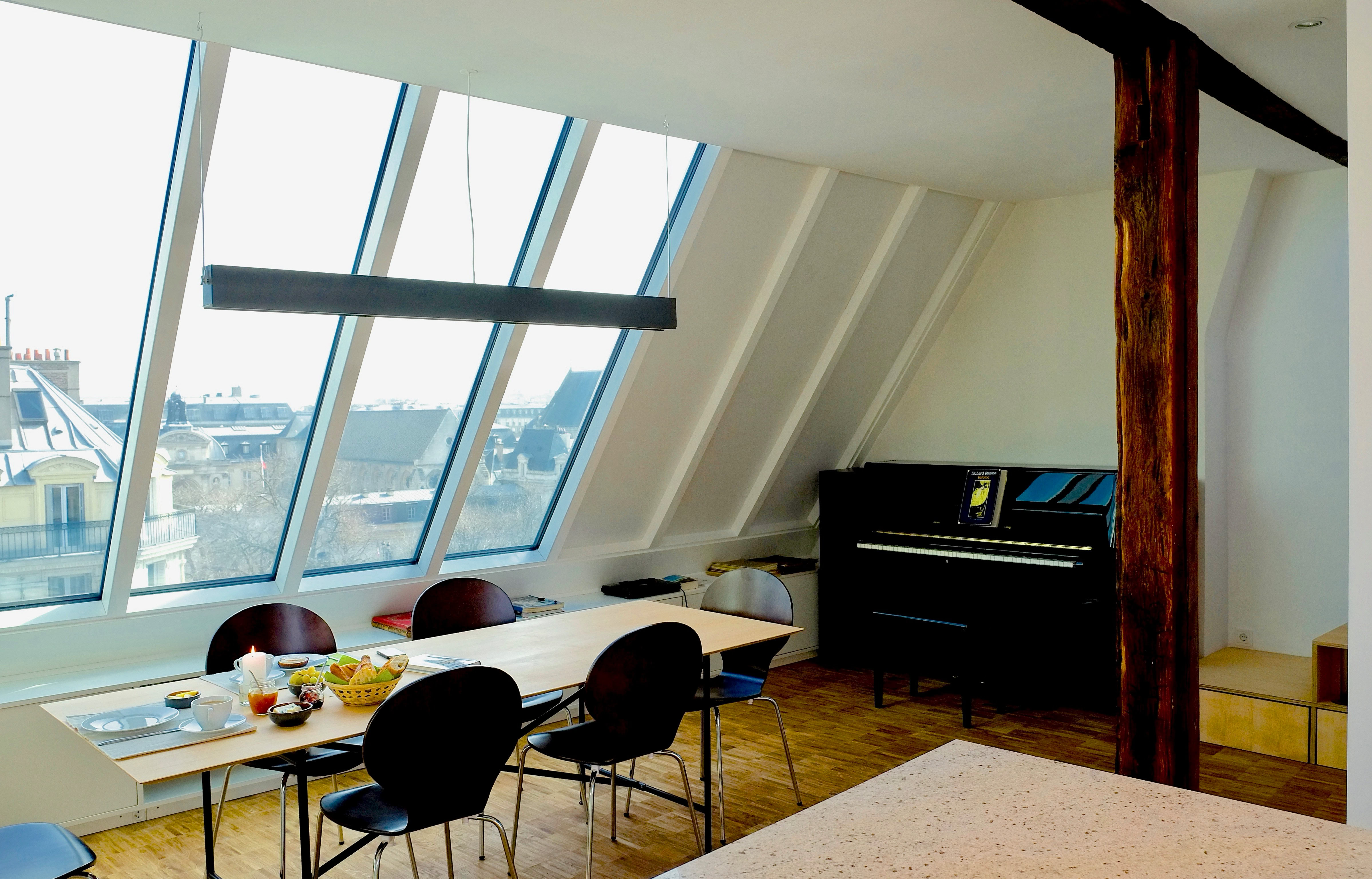Das Gebäude ist ein Original von 1895. Das Dach bestand vor dem Umbau aus einem Hausflur umgeben von sieben ehemaligen „chambres de service“, den jeder Wohnung zugeordneten Dienstmädchenzimmern. Nach vollständiger Entkernung entstand eine komplett neue geräumige Dachwohnung in modernster Passivhausbauweise.