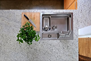 Die helle Granitplatte dient als durchgehende Arbeitsfläche, in die die großzügige Designerspüle flächenbündig integriert ist.