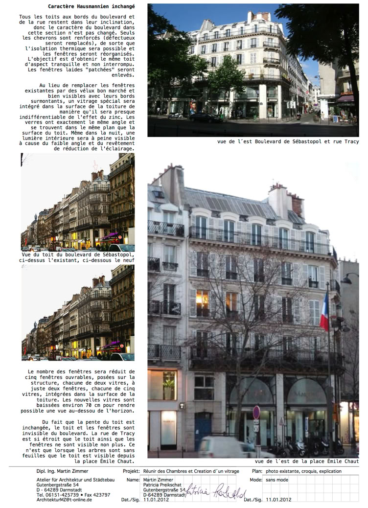 Der gebaute Entwurf ist das Ergebnis von sieben Jahren Ringen mit dem Bauamt von Paris, der positiv eingestellten Denkmalpflege (architectes des bâtiments de France) und der schwerfälligen CVP (commission du vieux Paris). Nach Einreichen des Bauantrags musste dieser unerwartet geändert werden („könnte ja das Stadtbild von Paris beeinflussen“), bis zur Genehmigung verging über ein ganzes Jahr.