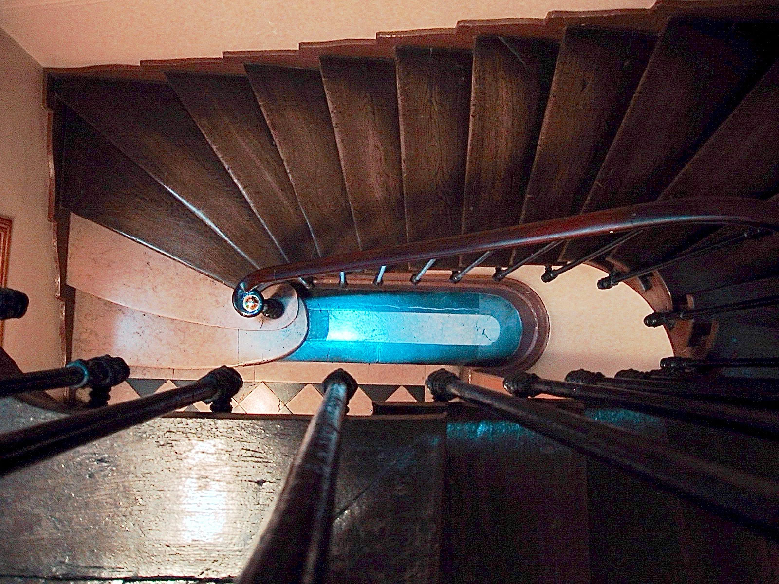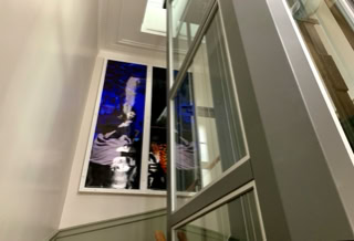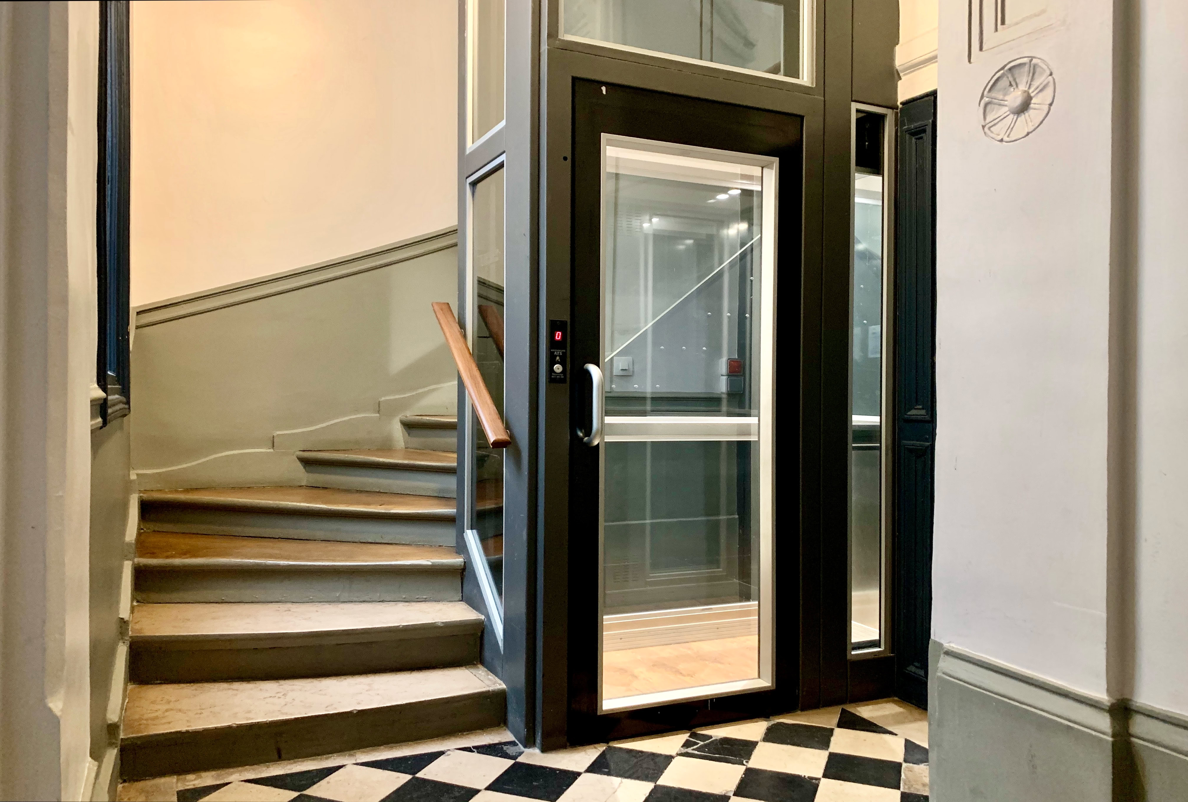 Der Aufzug ist dreiseitig verglast und wirkt dadurch hell und nicht beklemmend, obwohl er ganz schmal gebaut ist und in das erweiterte Treppenauge eingefügt wurde.