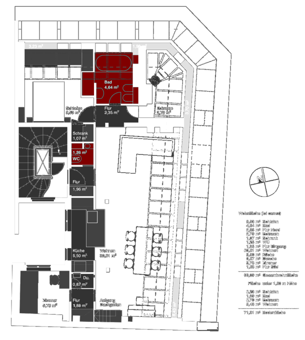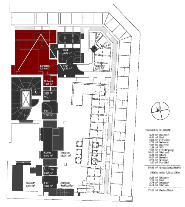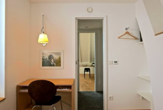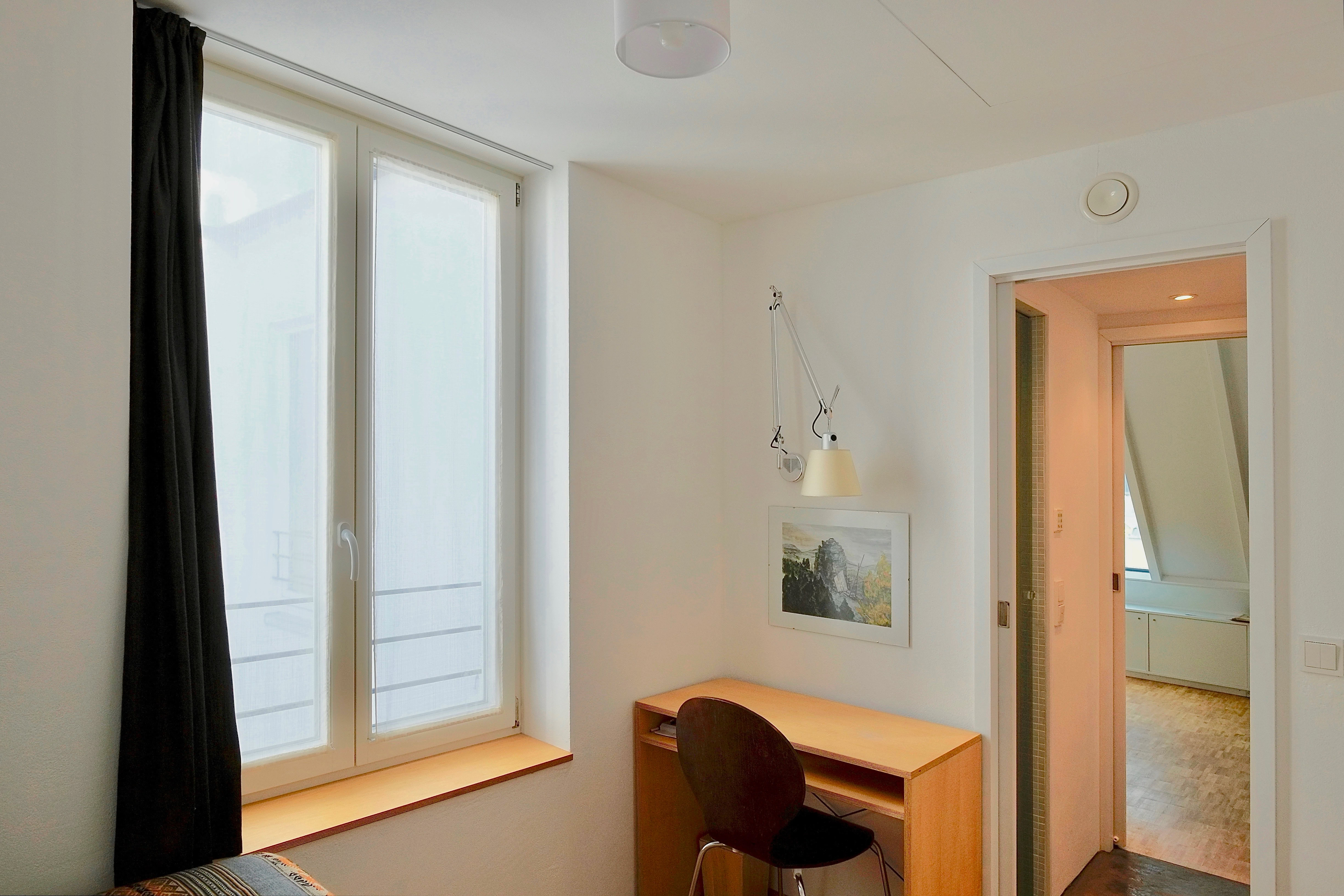 Zum Hof hin lieg das kleine Gästezimmer, in dem über ein Auszugsbett 80(160)x200cm Platz für maximal Zwei zum Schlafen ist. Es ist alternativ ein Raum der Ruhe und Konzentration, ideal zum ungestörten Arbeiten. Dank W-Lan ist man auch hier jederzeit mit der Welt verbunden.