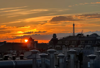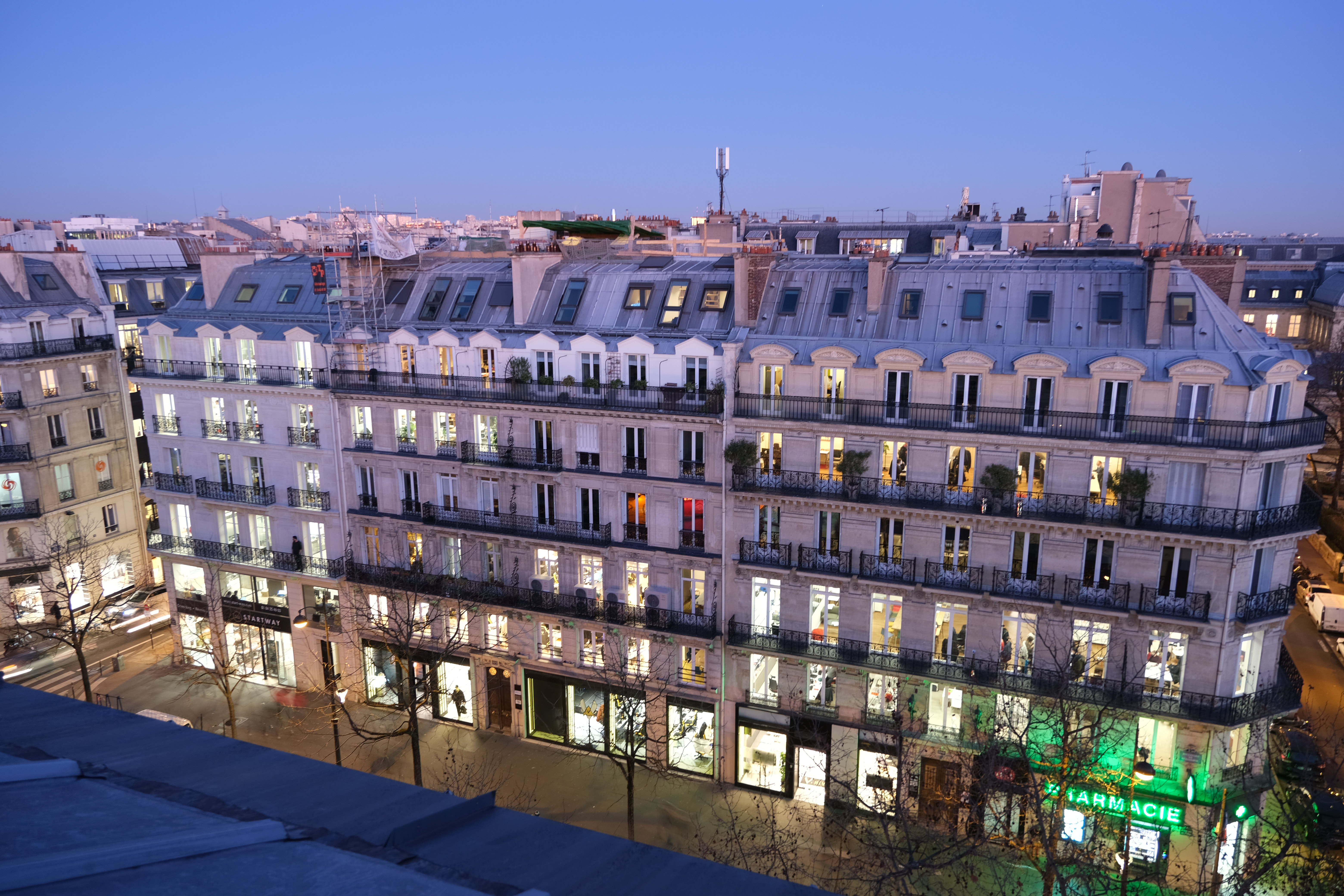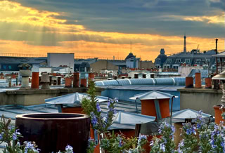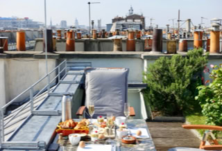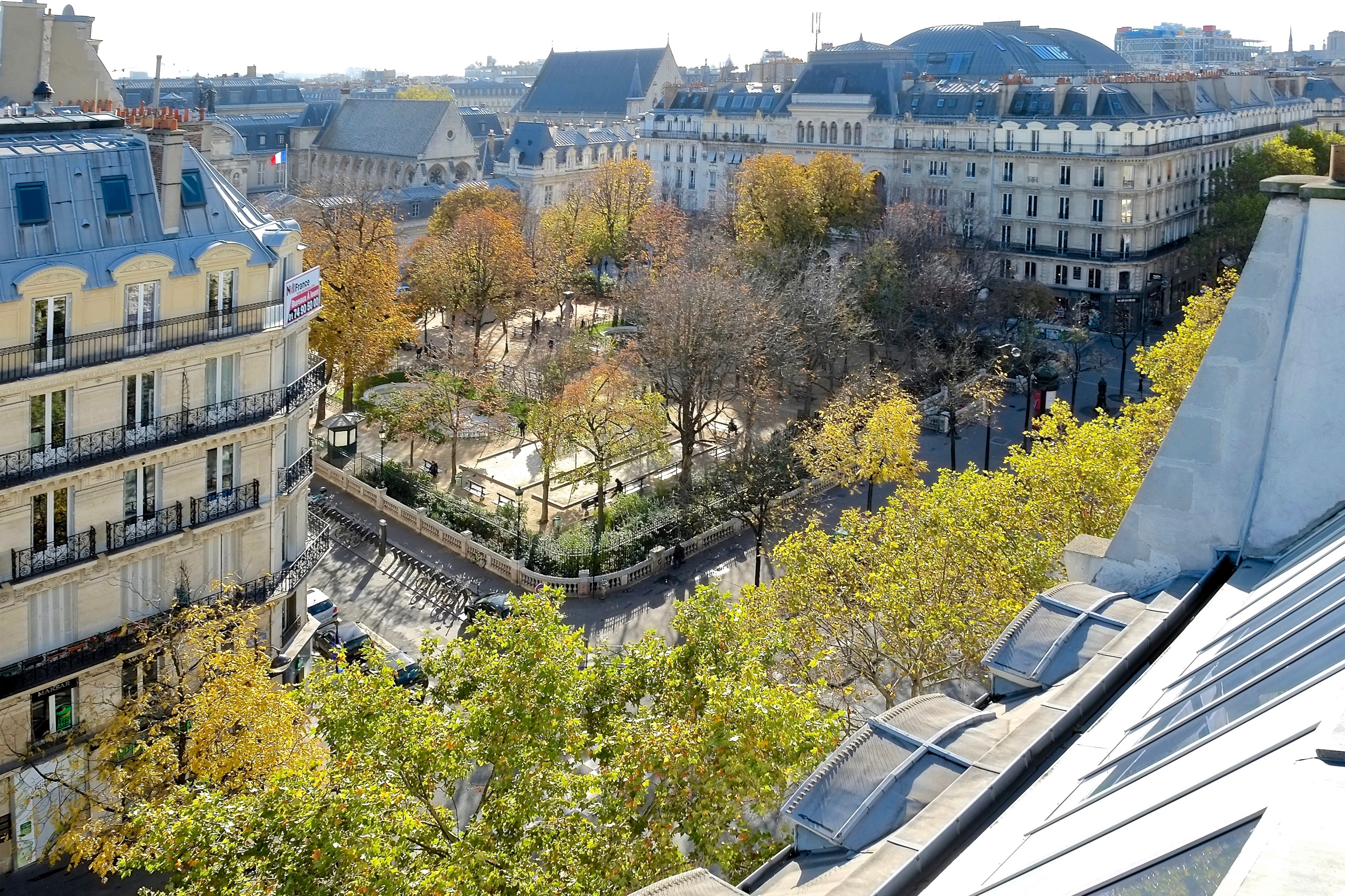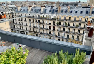 Alle große Monumente sind von der Terrasse aus zu sehen, von Sacré Cœre über Opéra, La Défense nach Süden, über den Eiffelturm, den Tour Montparnasse, St. Sulpice, St. Eustache, Tour Saint Jacques, Pantheon, Notre Dame, das Centre Georges Pompidou, Gaîté Lyrique und den Square Émille Chautemps gleitet der Blick weiter zu den historischen Gebäuden von Ars et Métiers.
