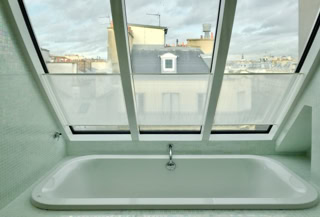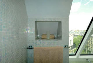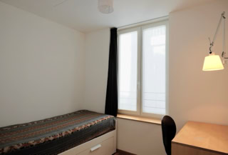 Auch mitten in Paris an einer bedeutenden Achse lässt es sich ruhig schlafen. Das Schlafzimmer liegt an der zur Fußgängerzone gehörenden Rue Tracy und ist durch die schallgeschützten Panoramafenster hell und freundlich. Die Spiegelwand zum Bad hin vergrößert den Raum optisch.