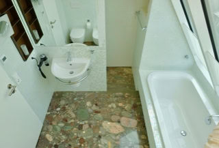 Das Bad mit Wanne, WC, Bidet Waschbecken und Dusche lebt von der Bodenplatte, die aus einem Stück gefertigt ist und niveaugleich in den Duschbereich übergeht. Sie erzählt von einem alten brasilianischen Flusslauf… Das leicht changierende Mosaik bildet einen harmonisch auf die Grüntöne der Bodenplatte abgestimmten Hintergrund und wird erweitert durch den großen Spiegel über dem Waschbecken. Mittels der LED-Steuerung lässt sich auch in der Beleuchtung mit unterschiedlichen Farbwechseln spielen.