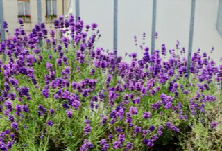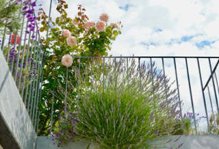 Ein Band von Lavendel umzieht den Rand der Terrasse. An der Pergola rankt eine zweifarbige Kletterrose und gegenüber eine Weinrebe. Himbeeren, Stachelbeeren und Johannisbeeren, ein Rosmarin-Monster und zahlreiche Kräuter gedeihen ebenfalls und werden über ein im Boden verlegtes Bewässerungssystem bewässert.