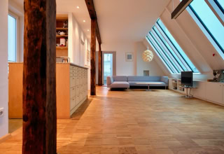 Durch die raumhohen Panoramafenster ist der Salon hell und lichtdurchflutet. Morgens spielt die Sonne auf dem warmen Parkettboden, abends fällt das Licht über die Küchenfenster in den Raum. Edle Materialien wie die Granitplatte des Küchenblockes und die Ahornoberfläche der Möbel kontrastieren mit den schlichten hellen Einbauschränken und Wänden.