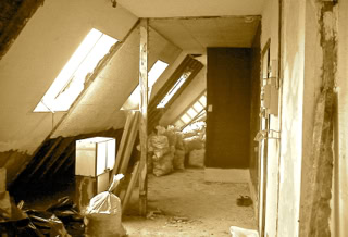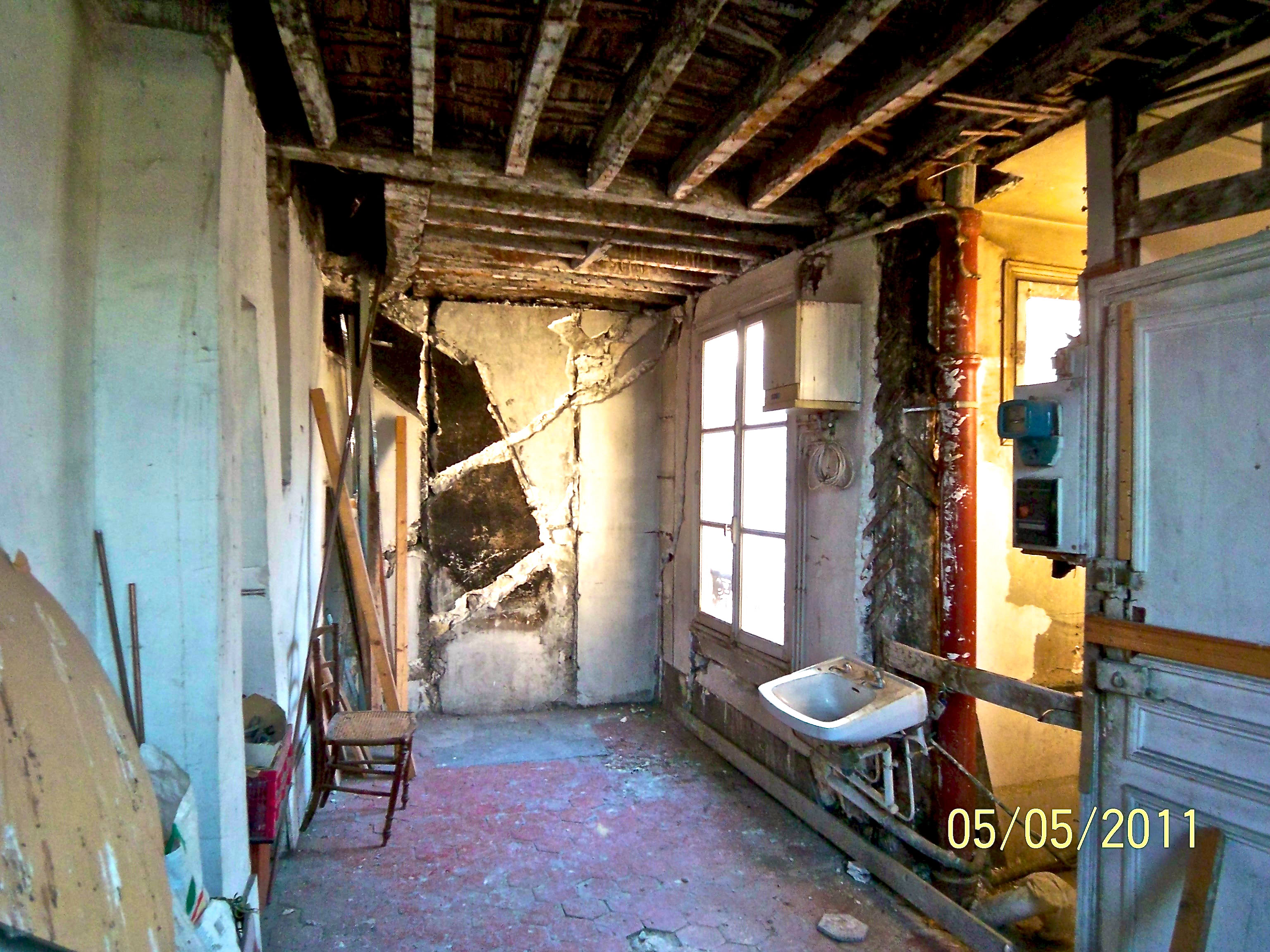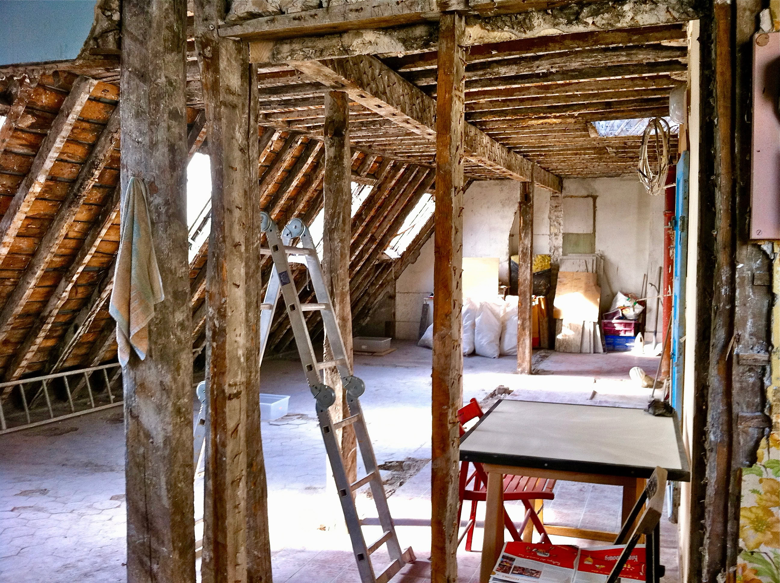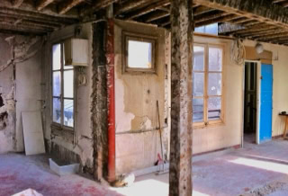 Am Anfang gab es 7 chambres de service um einen Flur mit WC und Waschbecken. Die Fenster waren zerbrochen, das Dach undicht. Die Aussenhülle musste erneuert und ein 15cm schiefer Boden ausgeglichen werden.