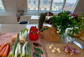 Die Küche mit Blick über den ganzen Wohnbereich und in den Innenhof hat Alles, was zum Vorbereiten, Kochen, Backen, Dekorieren und Anrichten benötigt wird.
